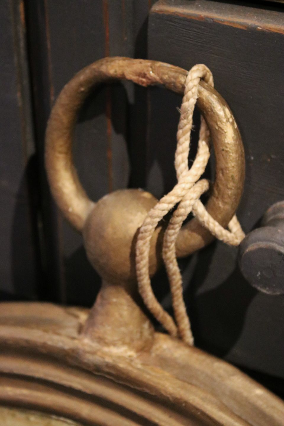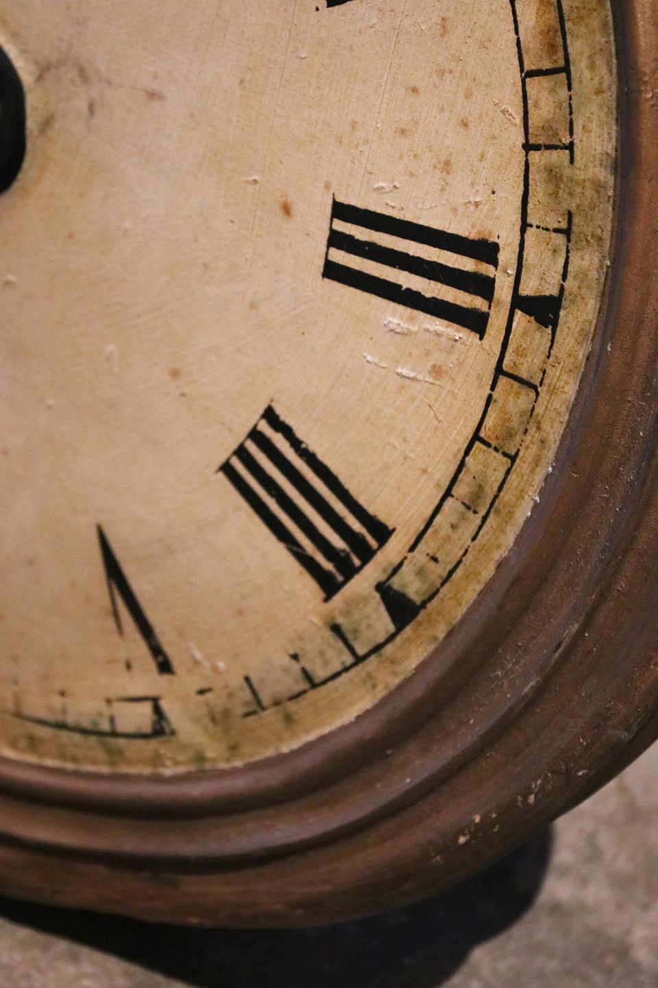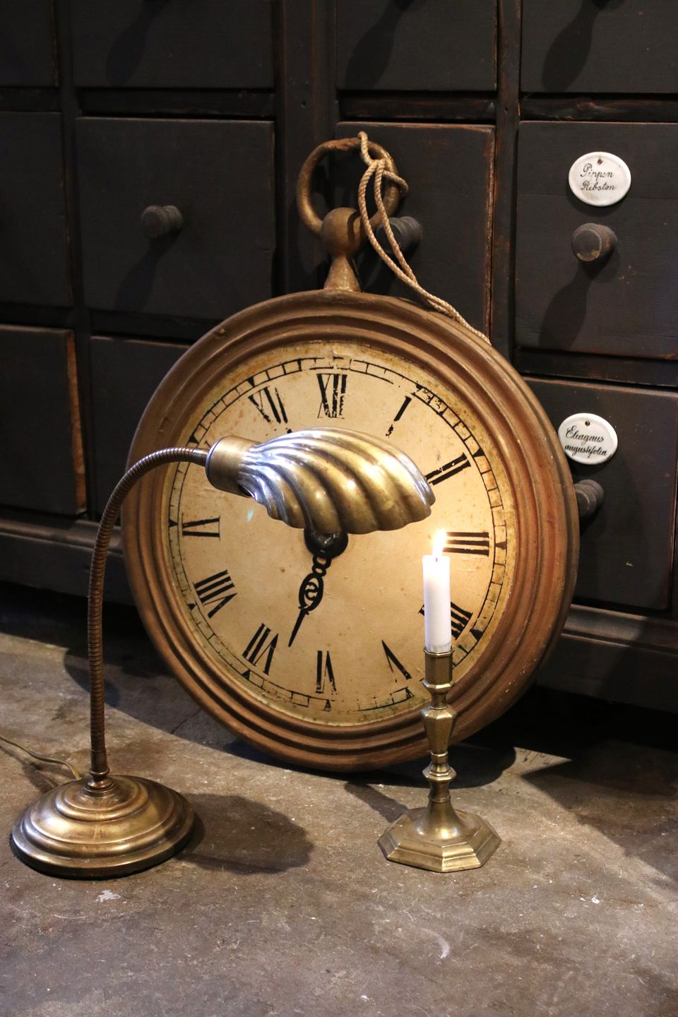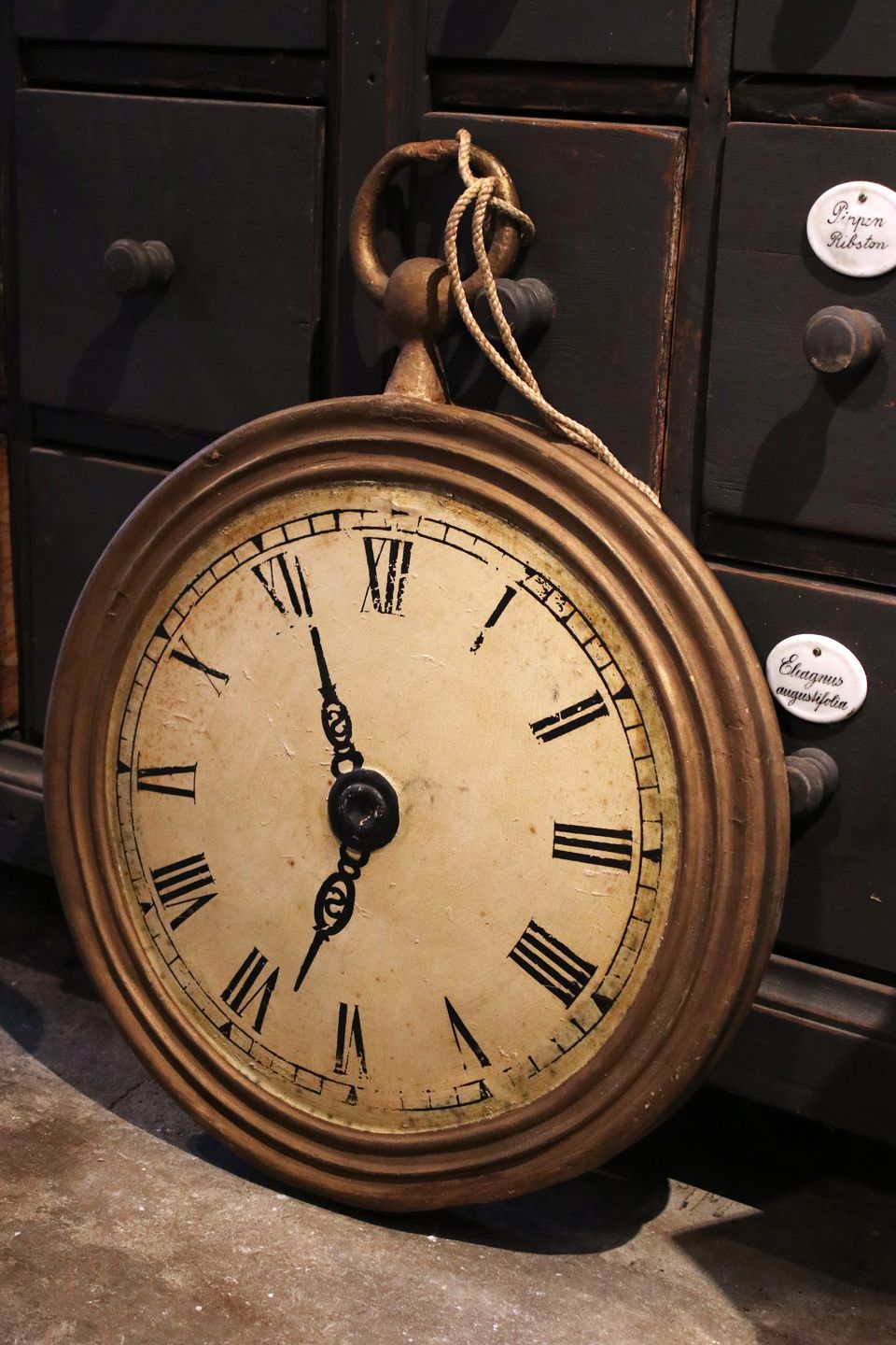 Decorative old wooden "clock" from a watchmaker's shop with old paint and a really nice patina. H: 68cm. Dia.: 47cm.There is a dial on both sides.