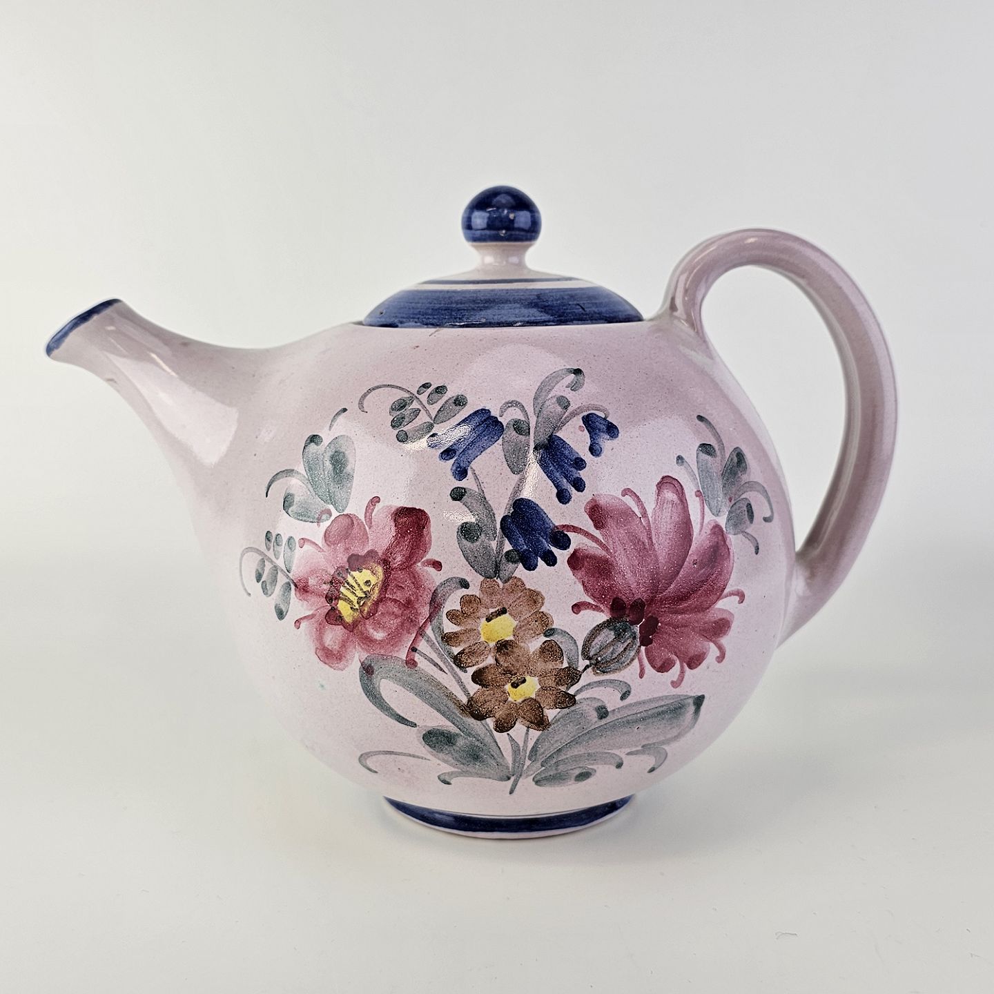 Håndlavet tekande i keramik. Rosa med blå detaljer og blomsterdekorationProducent Lars Syberg keramik