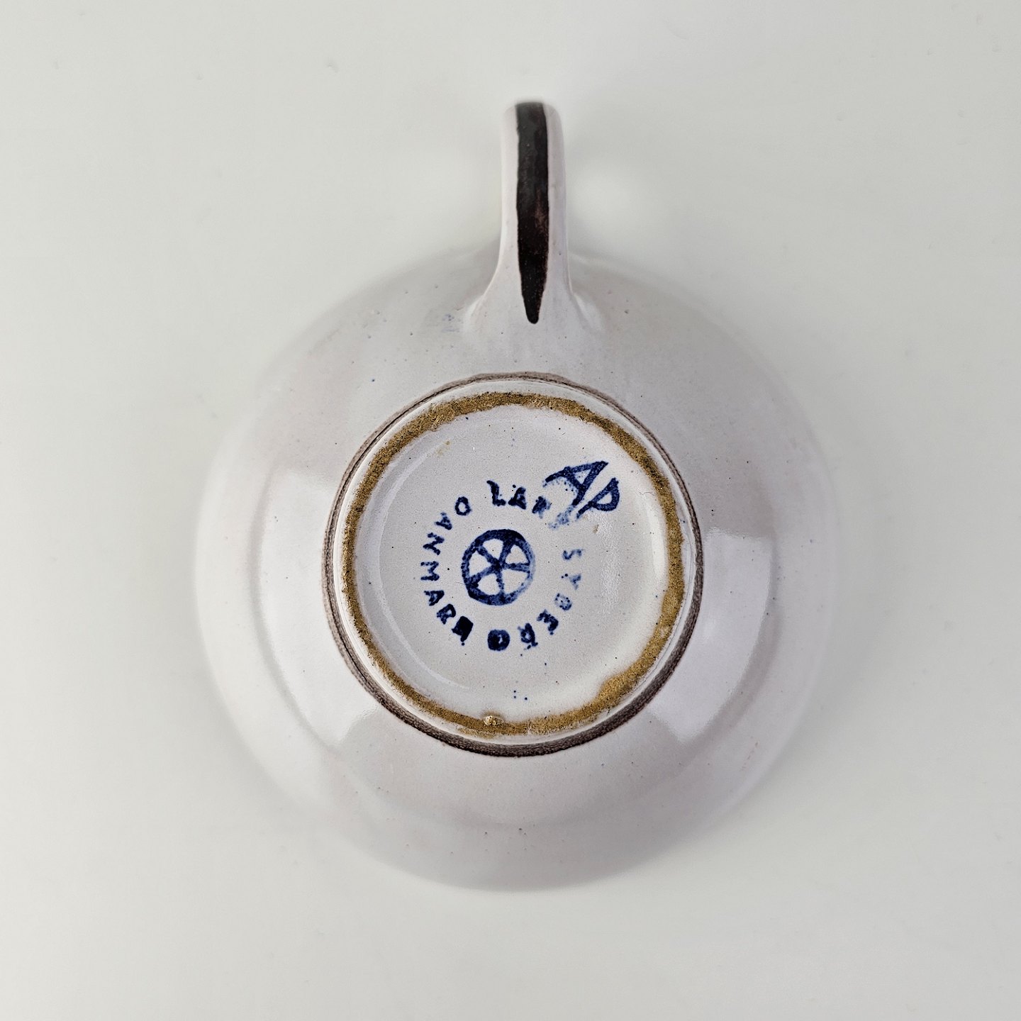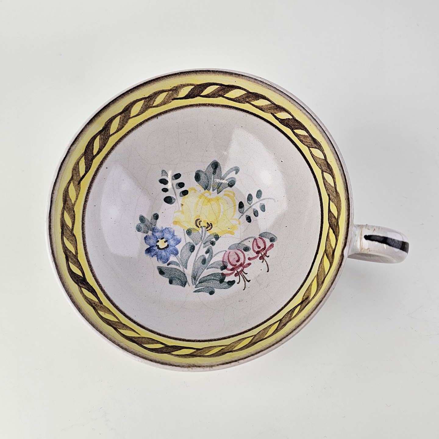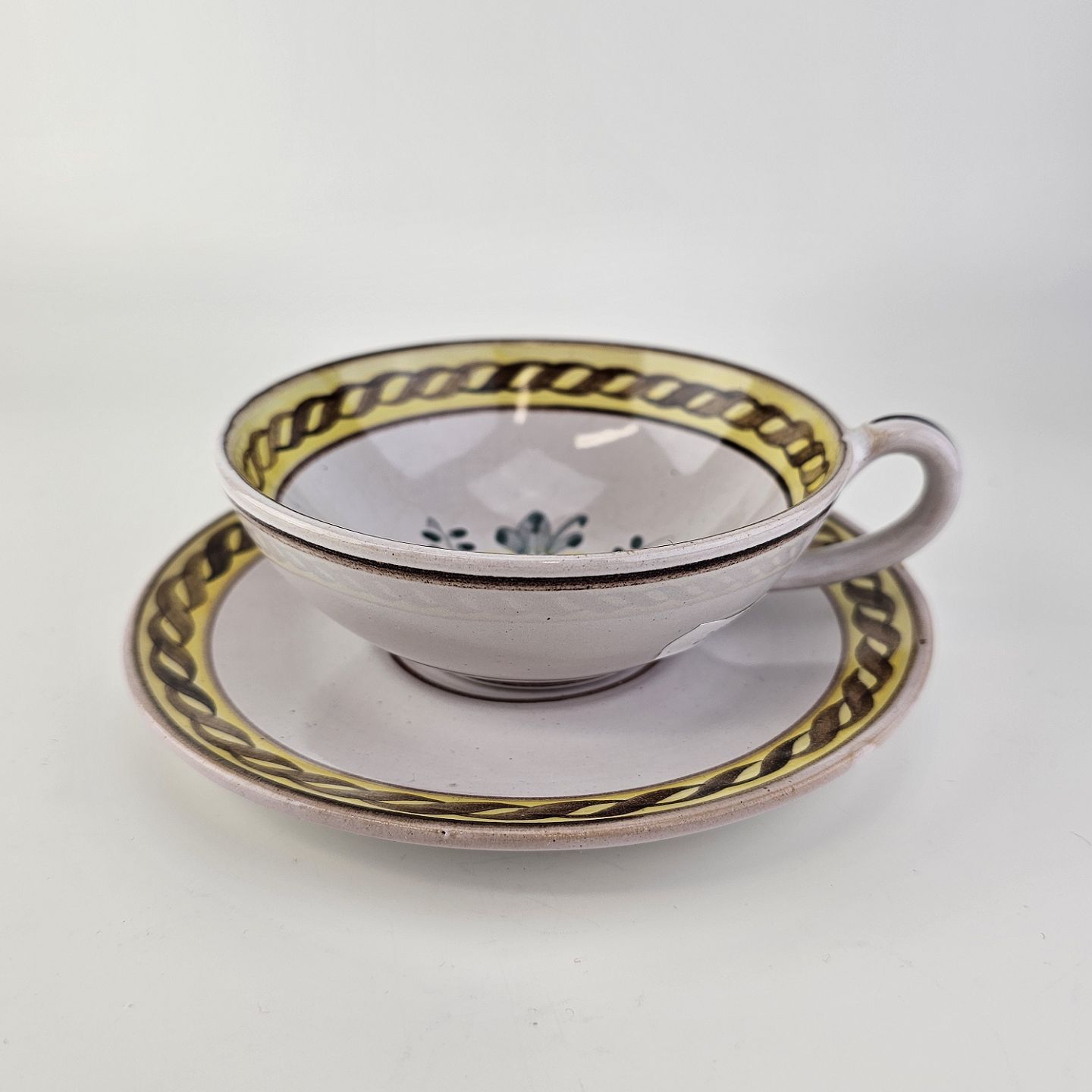 Kop og underkop i keramik med gule detaljer og blomsterdekorationProducent Lars Syberg keramik