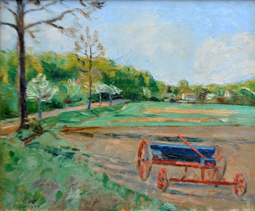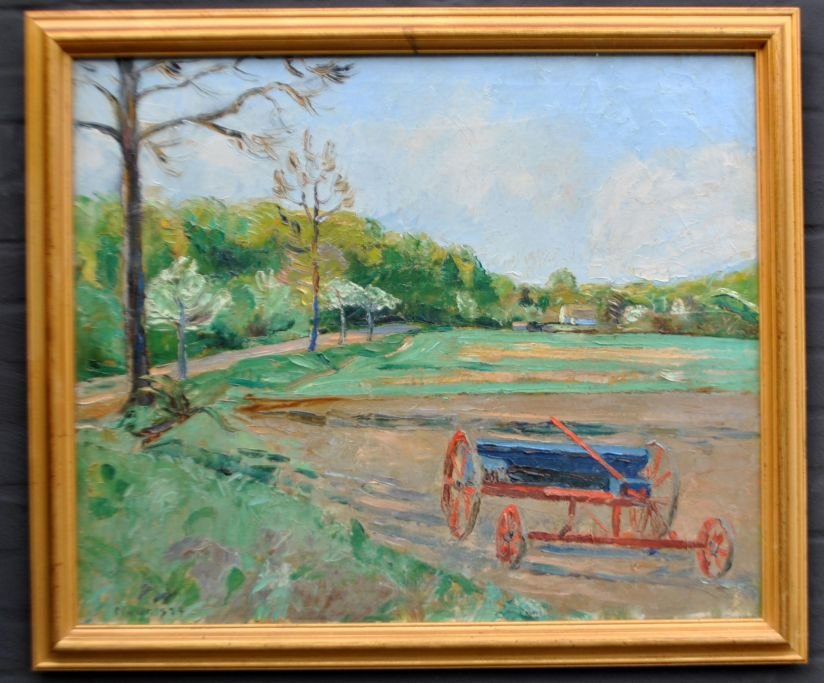 Naur, Albert (1889 - 1973) Denmark: A Seed Drill in a Field, 1929. Oil on canvas. Signed: Naur 1929. H: 64 cm. W: 77 cm.Framed H: 73 cm. W: 85 cm.