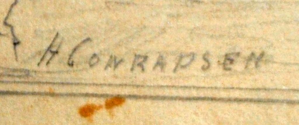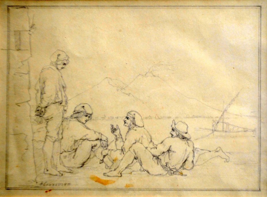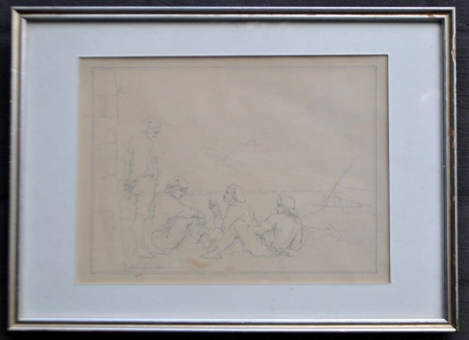 Conradsen, Harald (1817 - 1905) Denmark: Italian fishermen in conversation on the quay, with Vesuvius in the background. Signed 16 x 22.5 cm.Framed: 25 x 35 cm. in a silver frame.