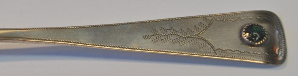 Peter Johannesen Petersen (1805 - 1873) Aabenraa, Denmark: Silver spoon with green glass. Stamped. L.: 23 cm. With engravings on the handle. With engraving: J. Jepsen, Eken den 9.9.1897.Item number: 28760