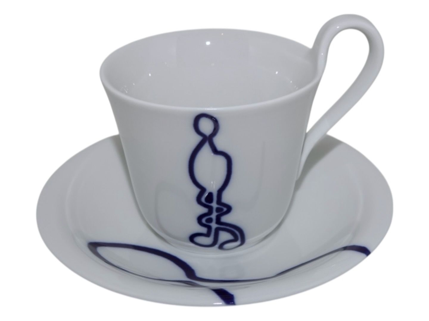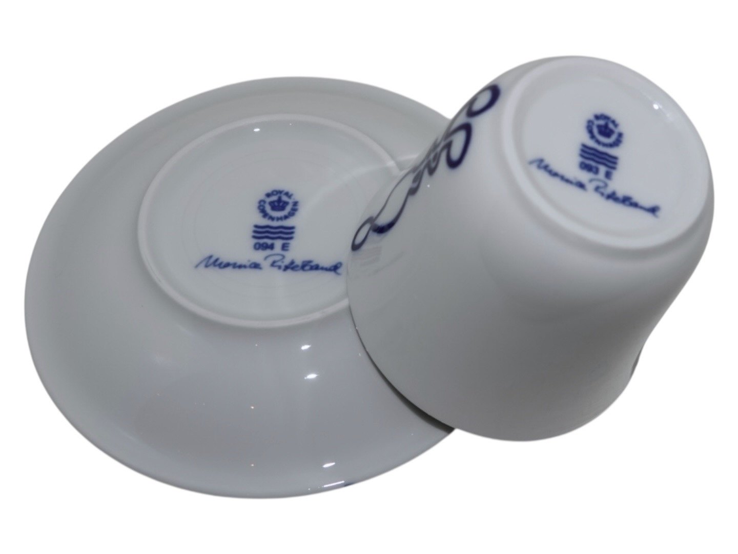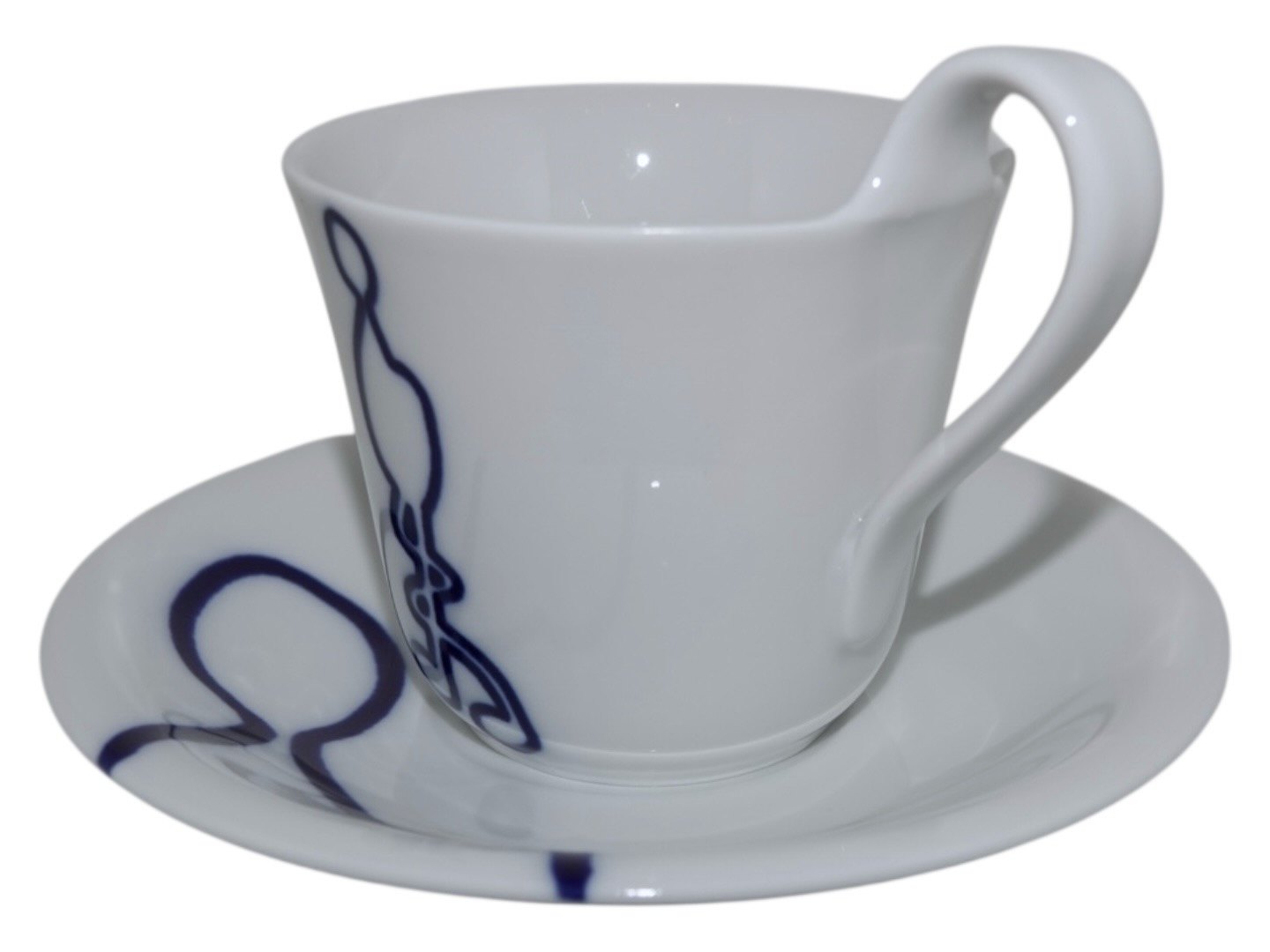 Royal Copenhagen Musica, high handle cup with matching saucer. Decoration E.Designed by Monica Ritterband.
