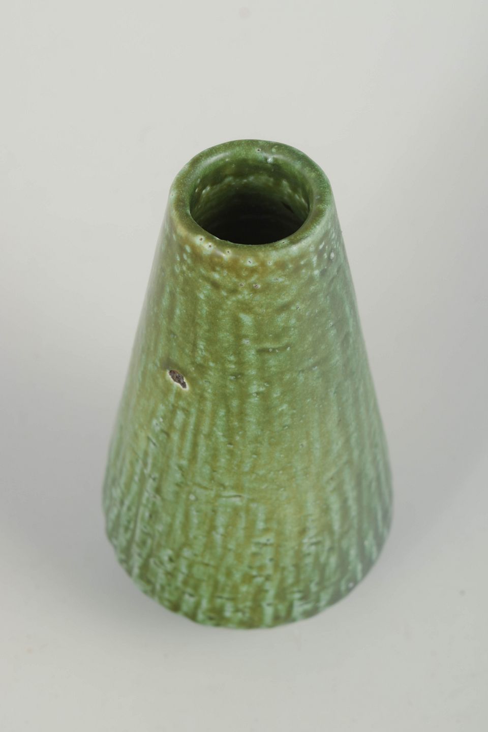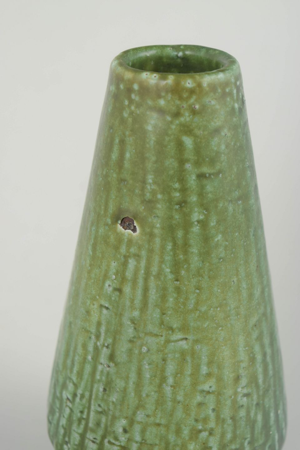 Organically shaped stoneware vase with a characteristic green flowing glaze typical of Nymølle production. The surface features a subtle vertical ribbed texture that enhances the depth and movement of the glaze. Minor glaze defect from production.