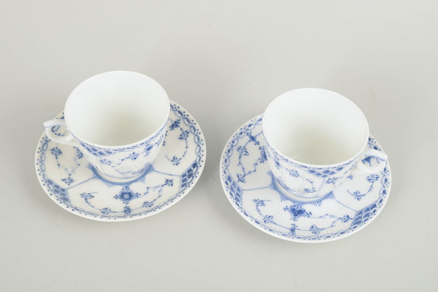 Set of two coffee cups with matching saucers in the Blue Fluted Half Lace pattern. Classic fluted forms with a lace border and hand-painted cobalt blue decoration. An elegant coffee set from the interwar period.