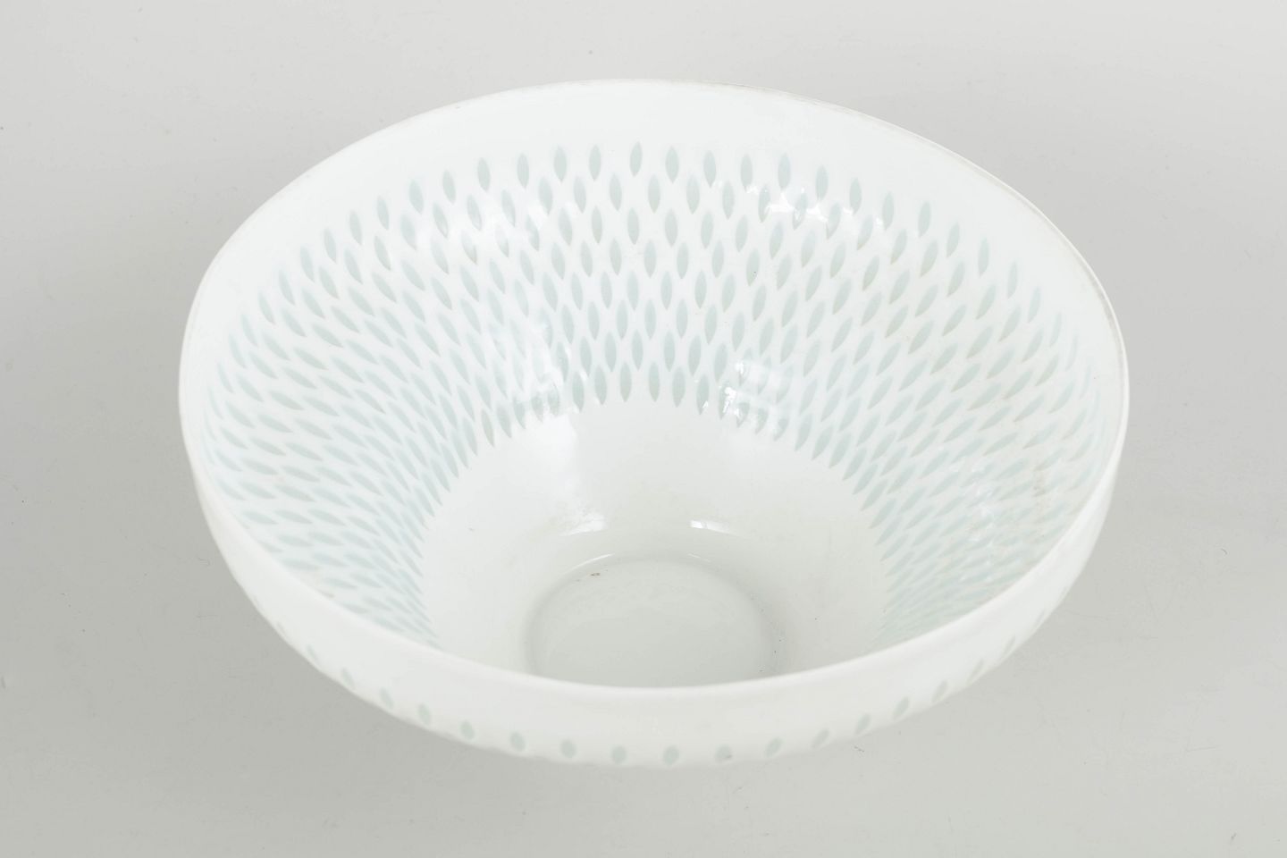 Large, elegant bowl in white porcelain with pierced “rice porcelain” decoration, where the fine perforated pattern creates a light and translucent effect. The balanced conical form and subtle surface treatment are characteristic of Friedl Holzer-Kjellberg’s modernist designs for Arabia.