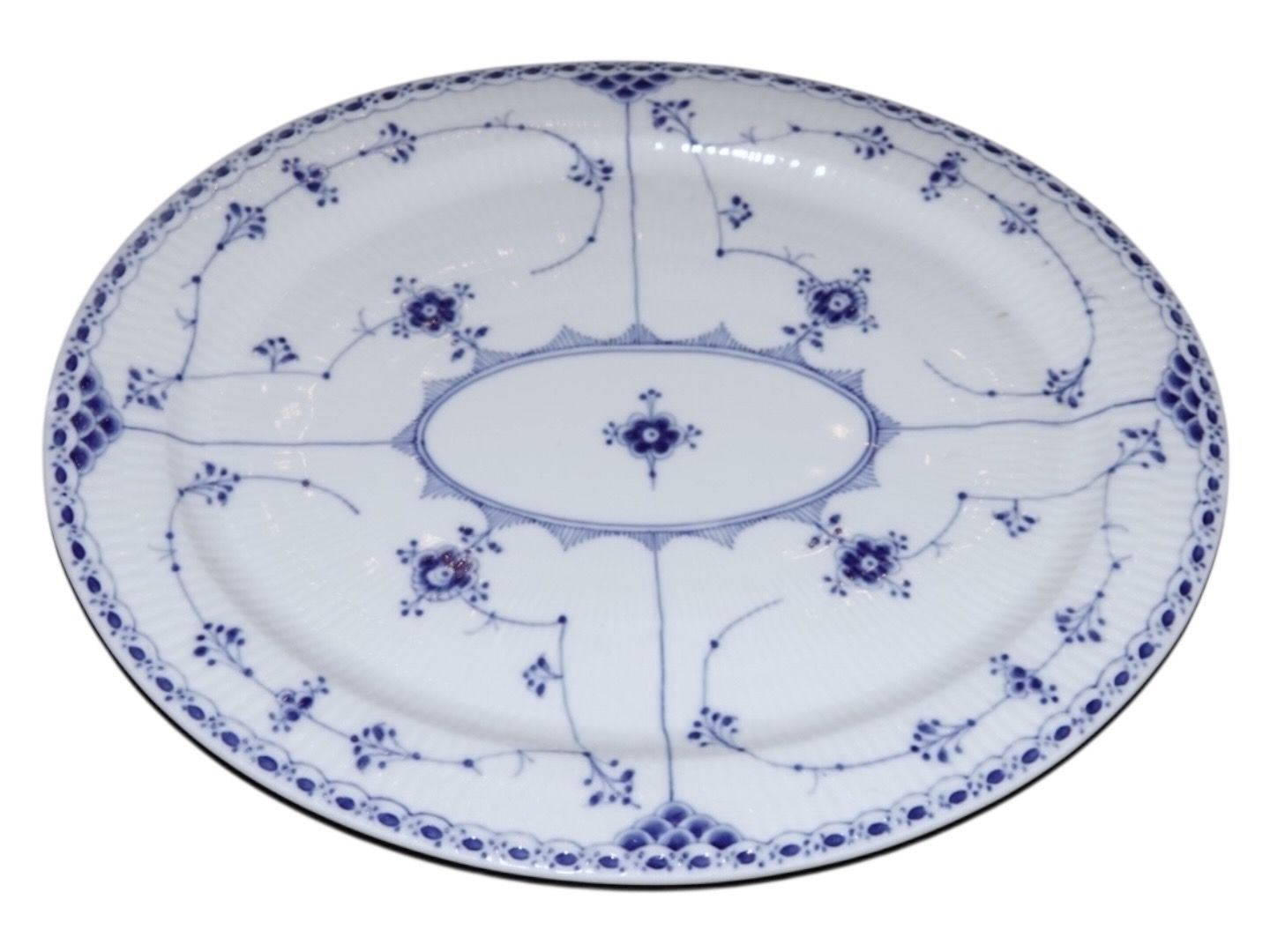 Royal Copenhagen Musselmalet Halvblonde, helfladt stegefad.Fabriksmærket viser, at denne er produceret i mellem 1898 og 1923.