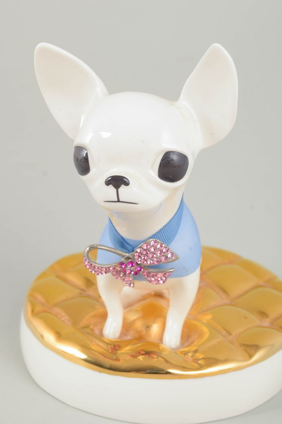 Uta Koloczek for Goebel Chihuahua, limited edition 42/100, 2000sDecorative porcelain figure depicting a chihuahua, executed in glossy glazed porcelain with painted decoration and an applied bow set with rhinestones. The figure stands on a cushion-shaped base with a gold-coloured surface. Produced by Goebel in a limited edition of 100 pieces.