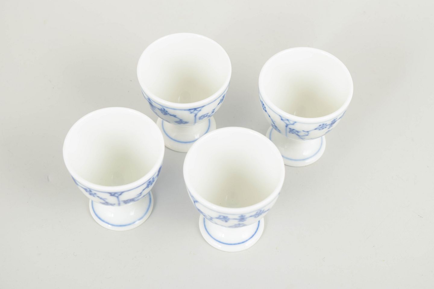 Royal Copenhagen Blue Fluted Plain egg cups, set of 4, 1920s.Set of four classic egg cups in Blue Fluted Plain, made in the traditional fluted form with pedestal foot and decorated with hand-painted cobalt blue underglaze. The egg cups feature elegant proportions typical of early 20th-century tableware.