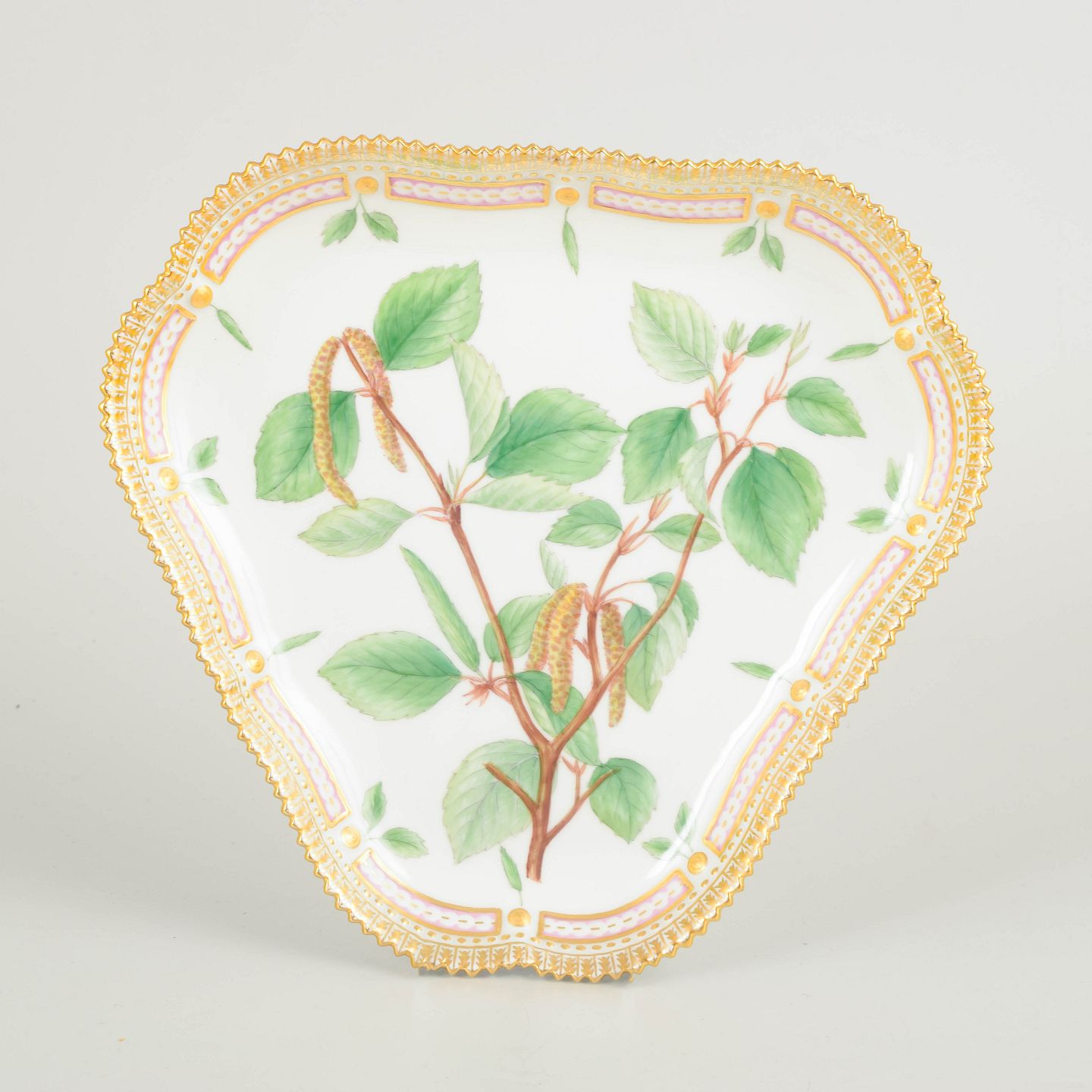 Royal Copenhagen Flora Danica triangular dish, 1963.Elegant dish from the iconic Flora Danica service, hand-painted with a botanical motif derived from the Flora Danica publication. The dish is executed in the service’s characteristic refined form with a decorative rim and a balanced, organic contour. A classic serving piece suitable for smaller servings or as part of a complete Flora Danica service.