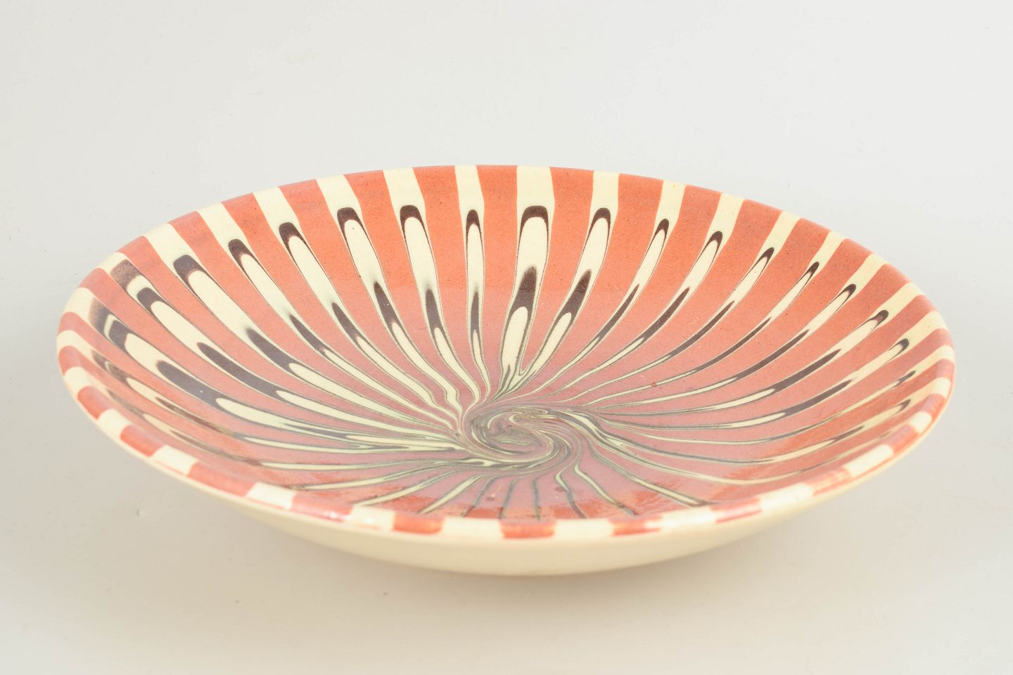Decorative faience bowl with a characteristic swirling slip decoration in pink, cream and dark contrasting tones. The wide, shallow form accentuates the dynamic spiral pattern, typical of Kähler’s artistic production during the interwar period. A fine example of Danish ceramic art from the 1930s.