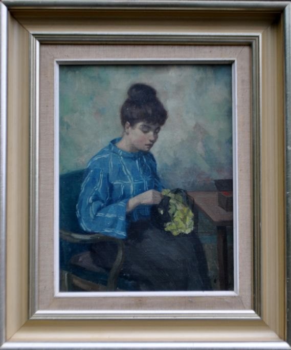 Helme, Helge (1894 - 1987) Denmark: A Woman Sewing. Oil on canvas. Signed: H. Helme. H: 35.5 cm. W: 27.5 cm.Framed: H: 50 cm. W: 42 cm.