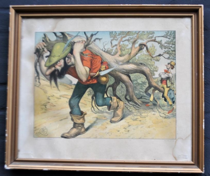 Moe, Louis (1877 - 1945) Denmark: Composition with man carrying a tree. Color lithograph. Signed in the print. Published by Alfred Jacobsen, Copenhagen. 27.5 x 36 cm.Framed: 41 x 49 cm.
