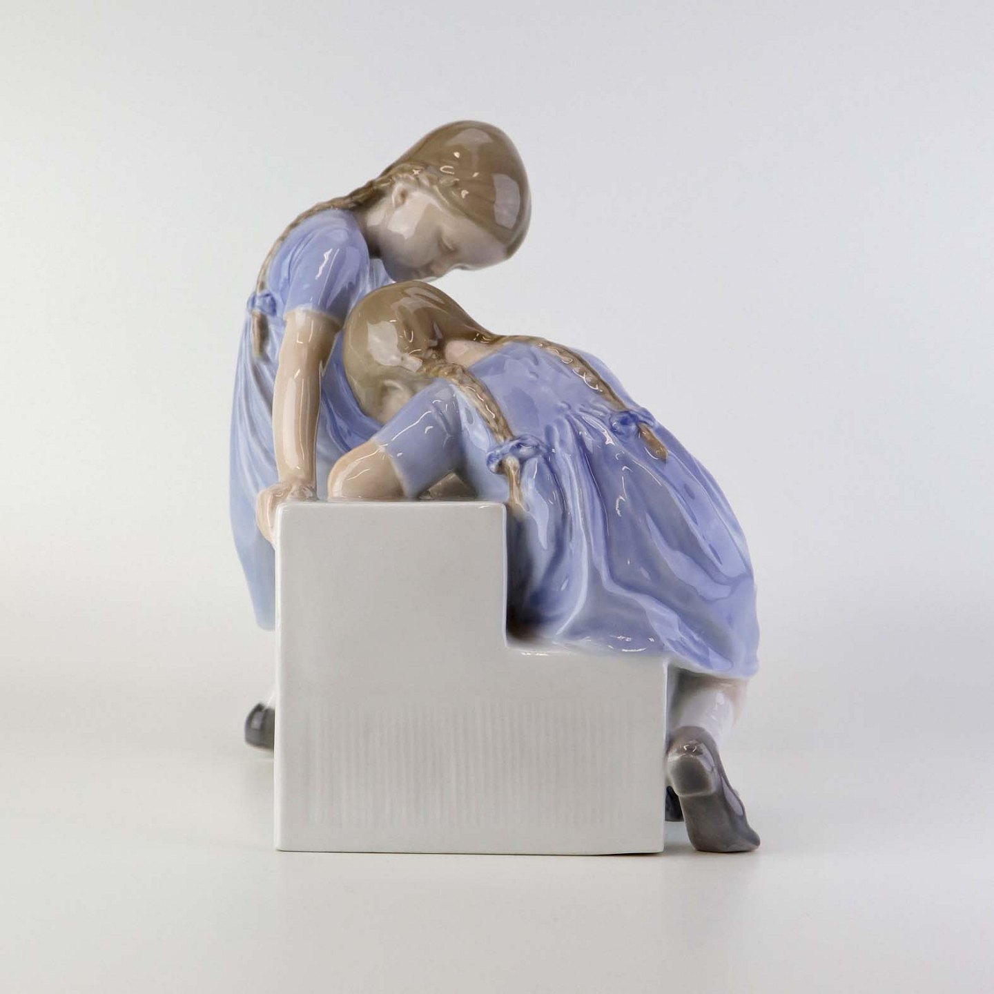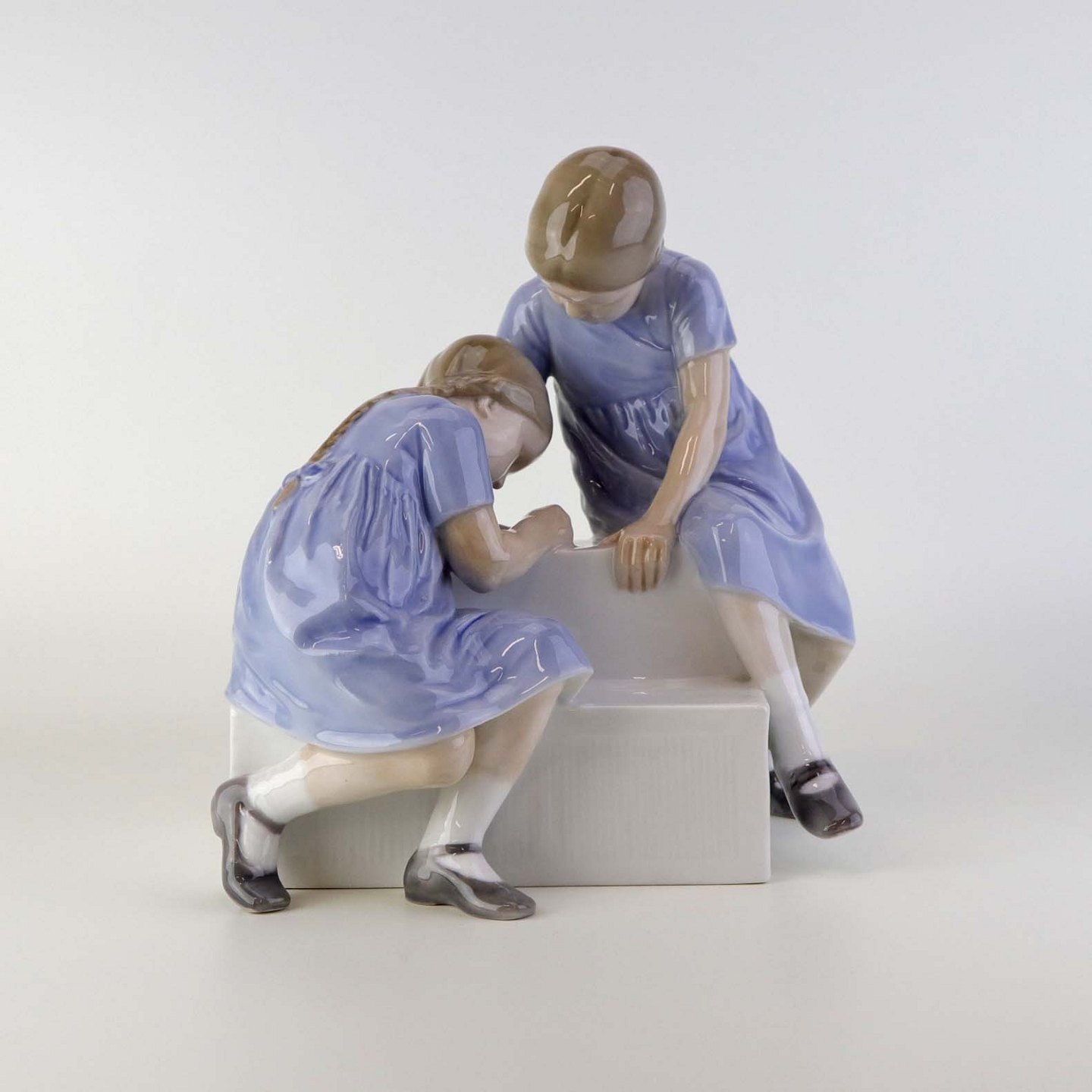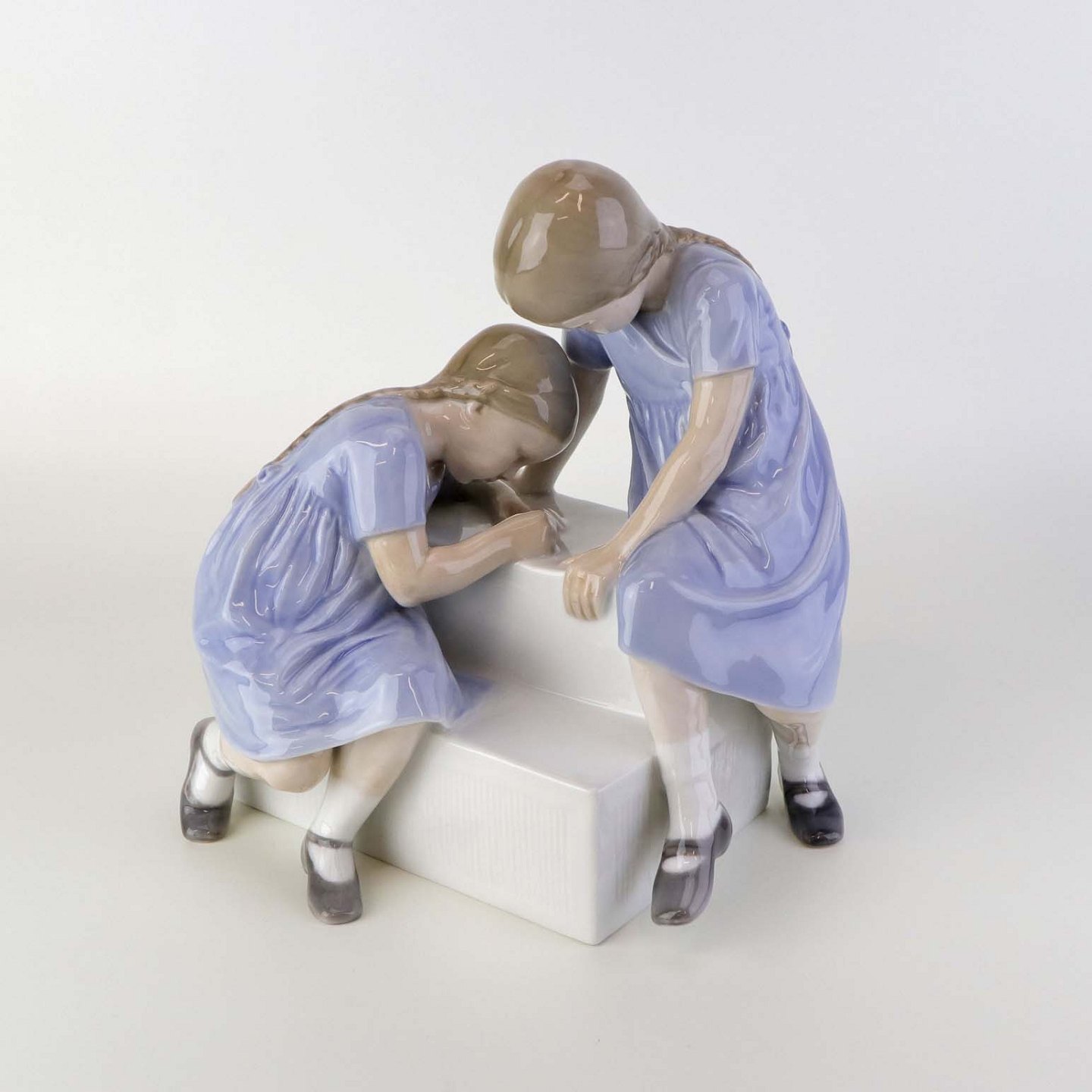 Figur i porcelæn med motiv af to piger på en tappesten. Nr. 1871Producent Bing & Grøndahl