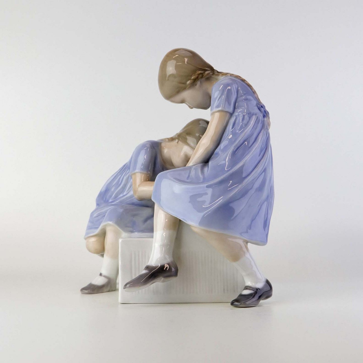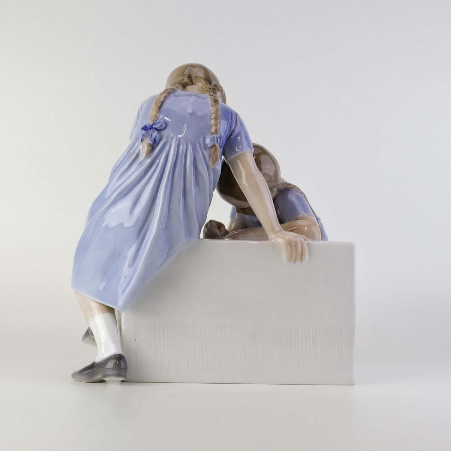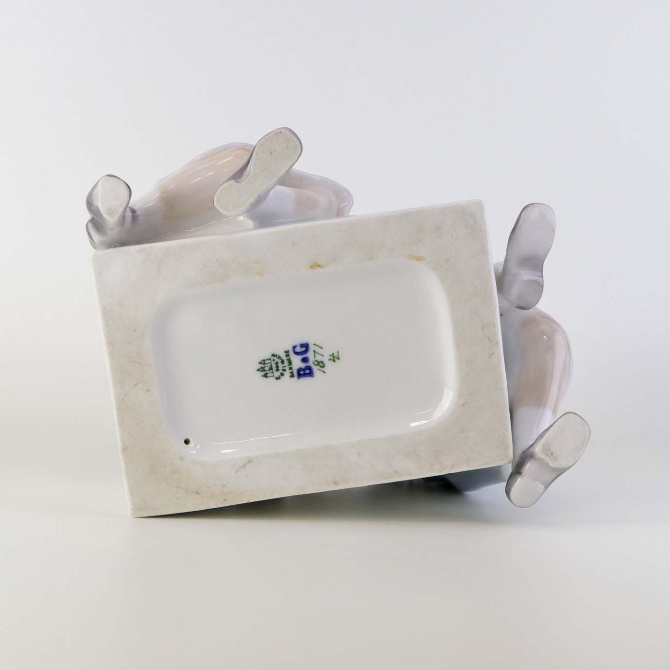 Figur i porcelæn med motiv af to piger på en tappesten. Nr. 1871Producent Bing & Grøndahl