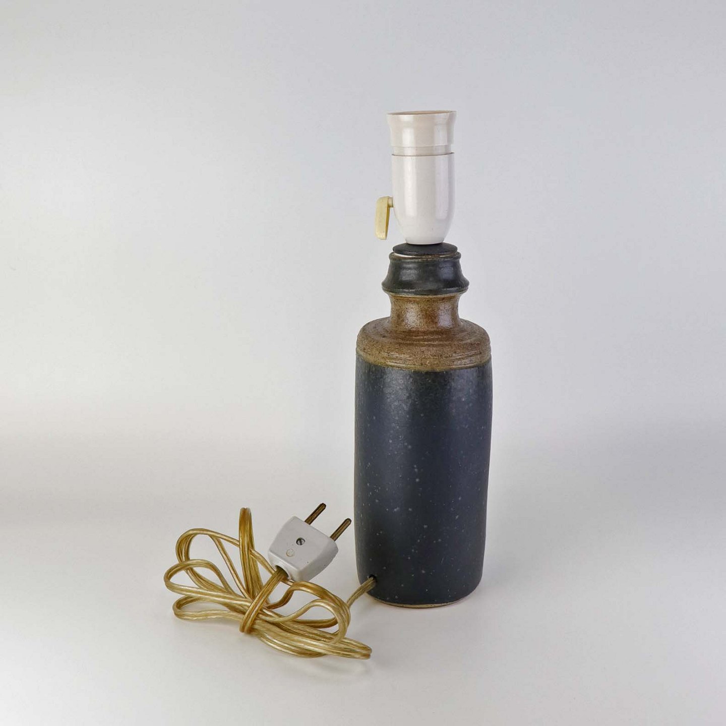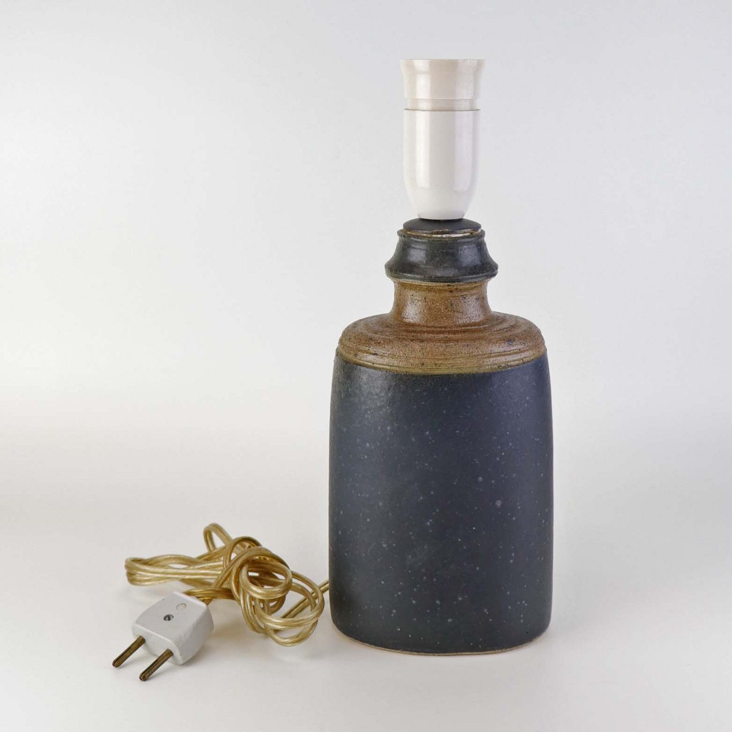 Oval lampefod i keramik med brun og blåsort glasering og lys plastfatning.