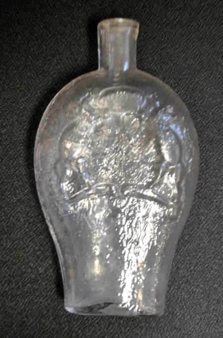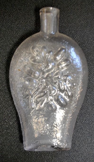 Swedish flask in clear glass, 19th century. With the Swedish coat of arms and motif of oak leaves and acorns. L: 17.5 cm.Item number: 28683