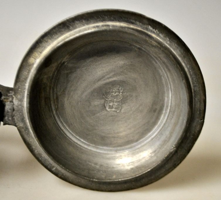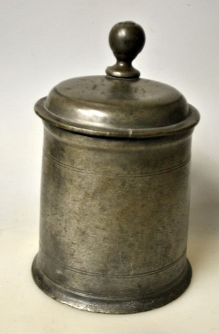 Pewter mug 1763, Germany. Conical with handle and spout. Stamped in lid. H.: 16 cm. Engravings on lid.Item number: 28723