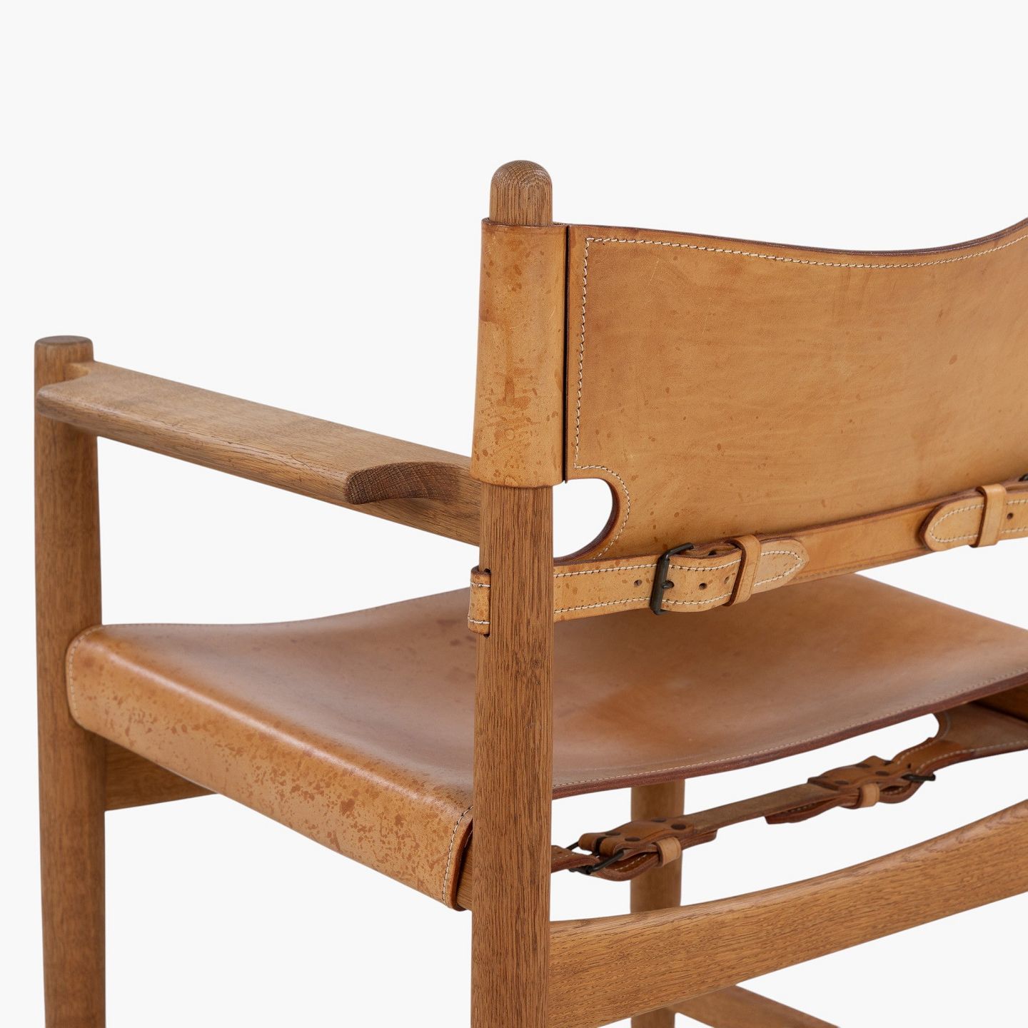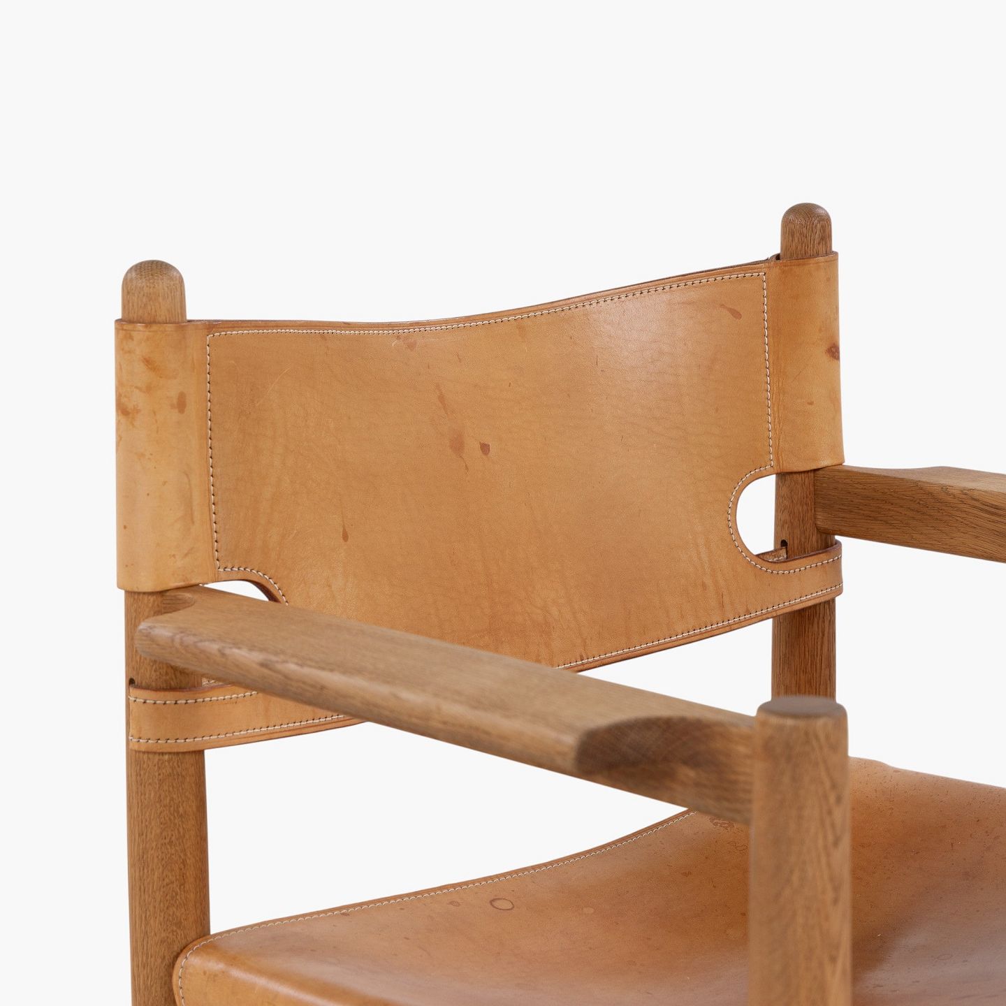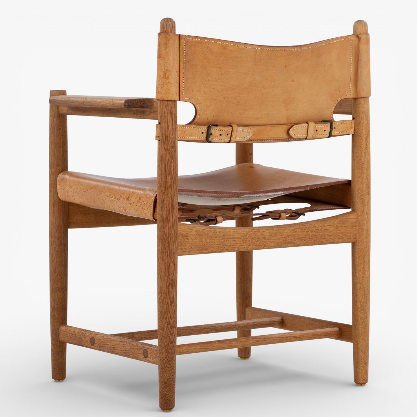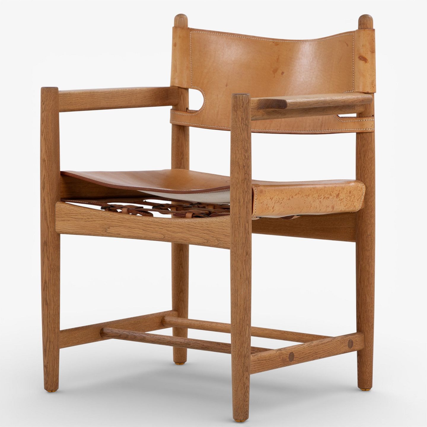 BM 3238 - 'Hunting chair' in patinated oak and full grain leather with armrests. Manufacturer's mark.