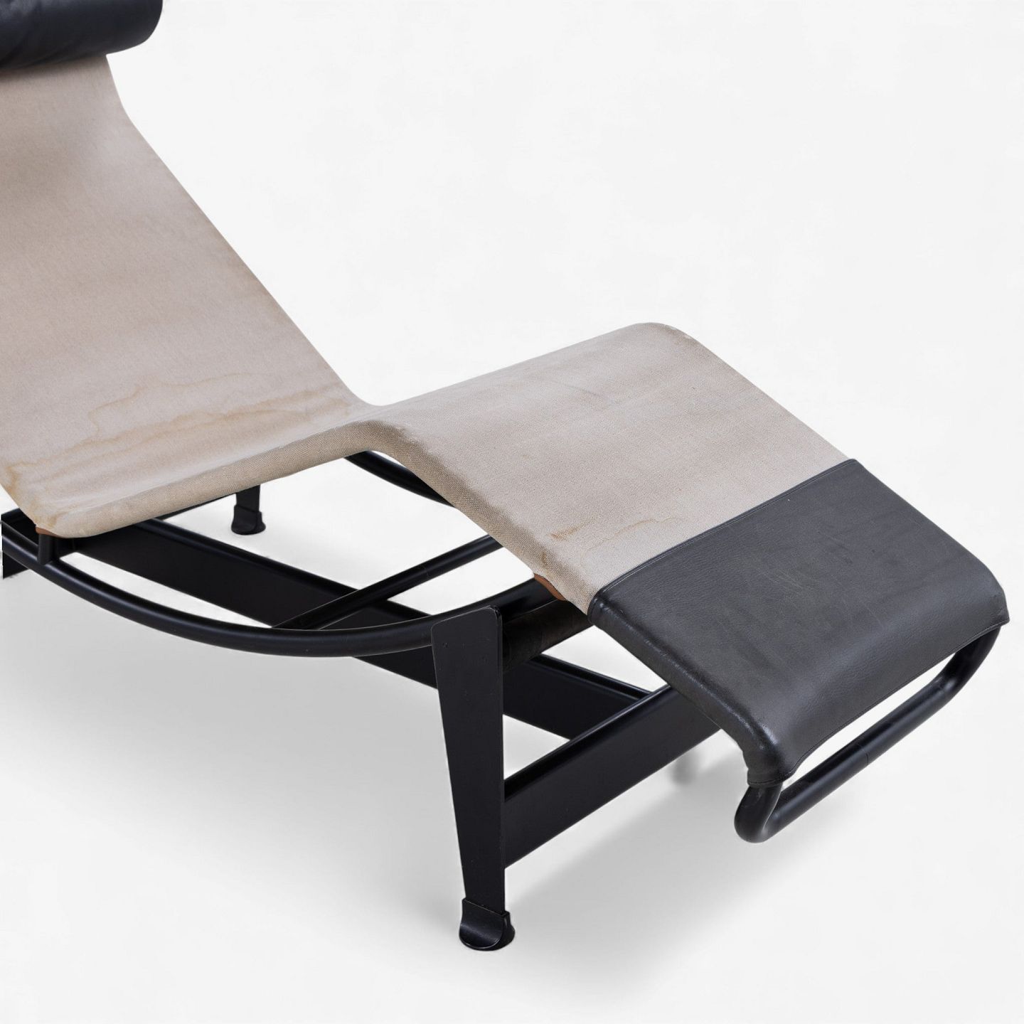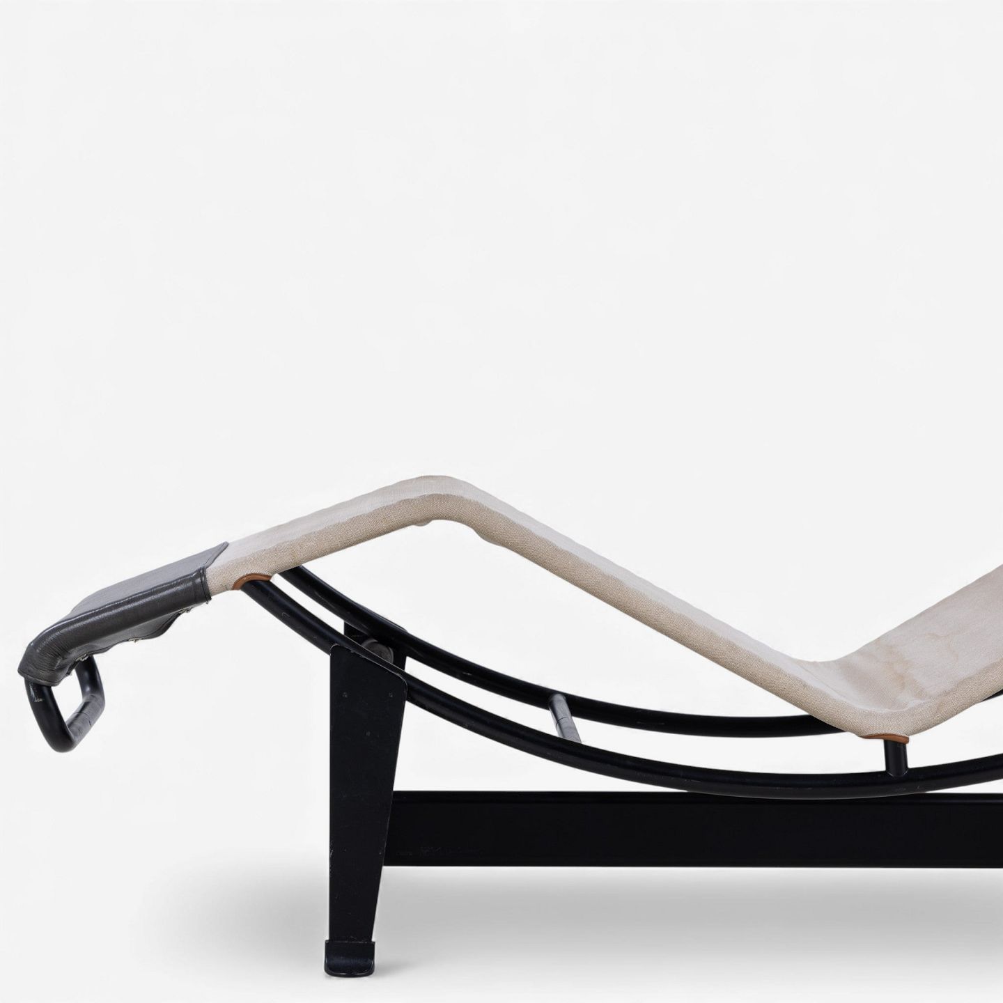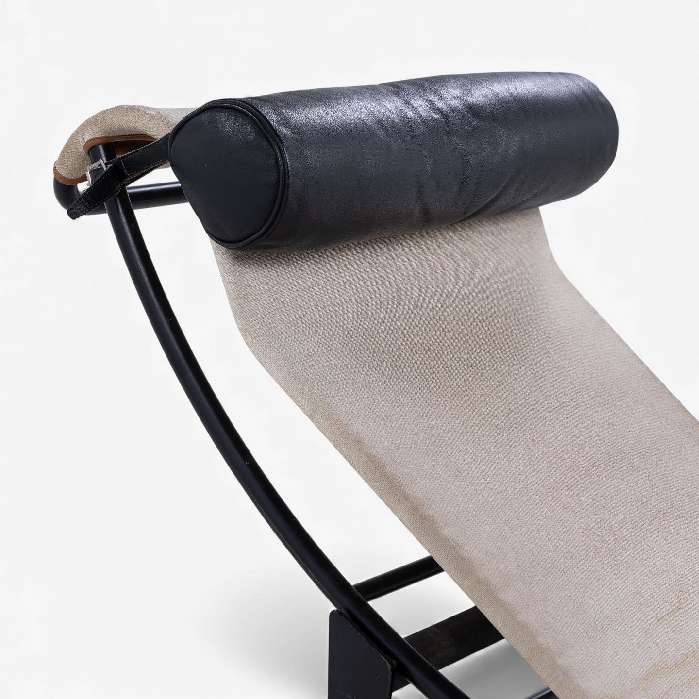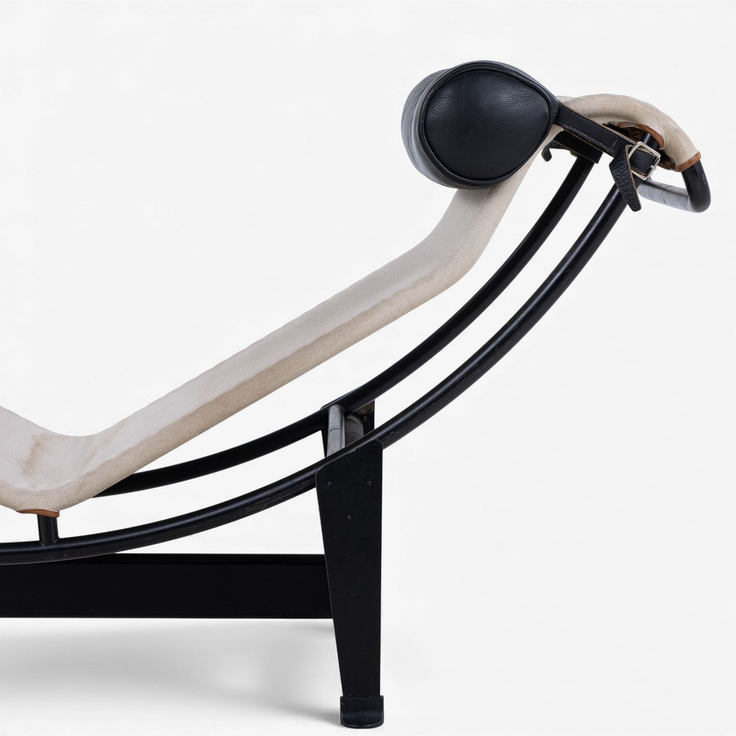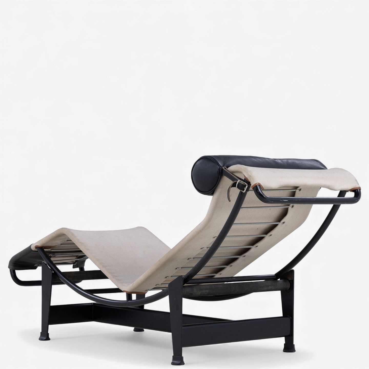 LC 4 - Chaise longue in patinated natural canvas and black leather on a black lacquered steel frame. Designed in 1928.