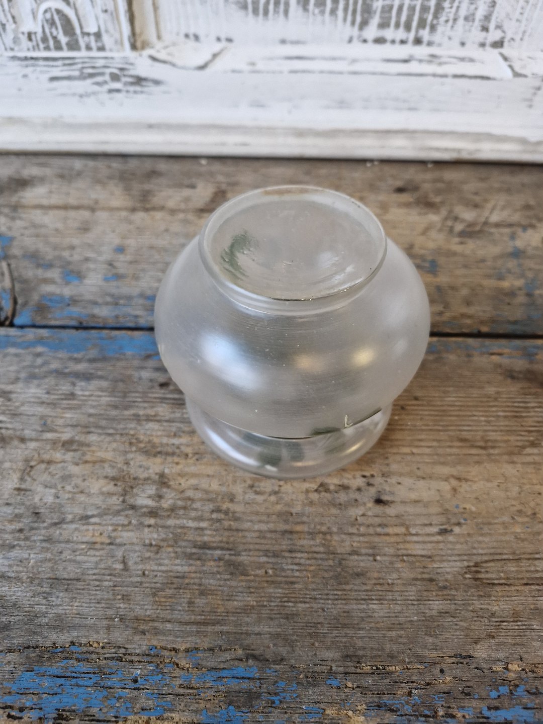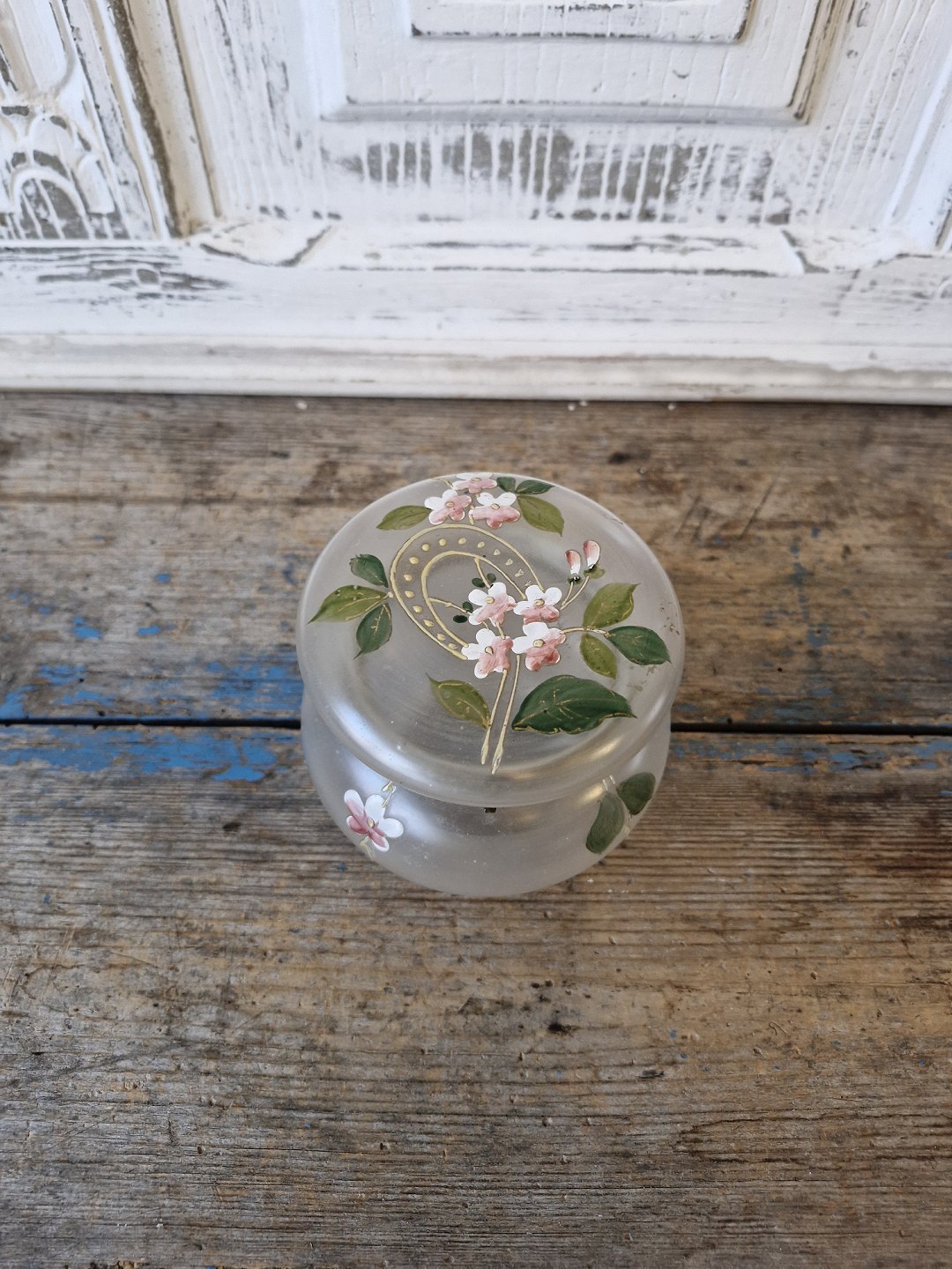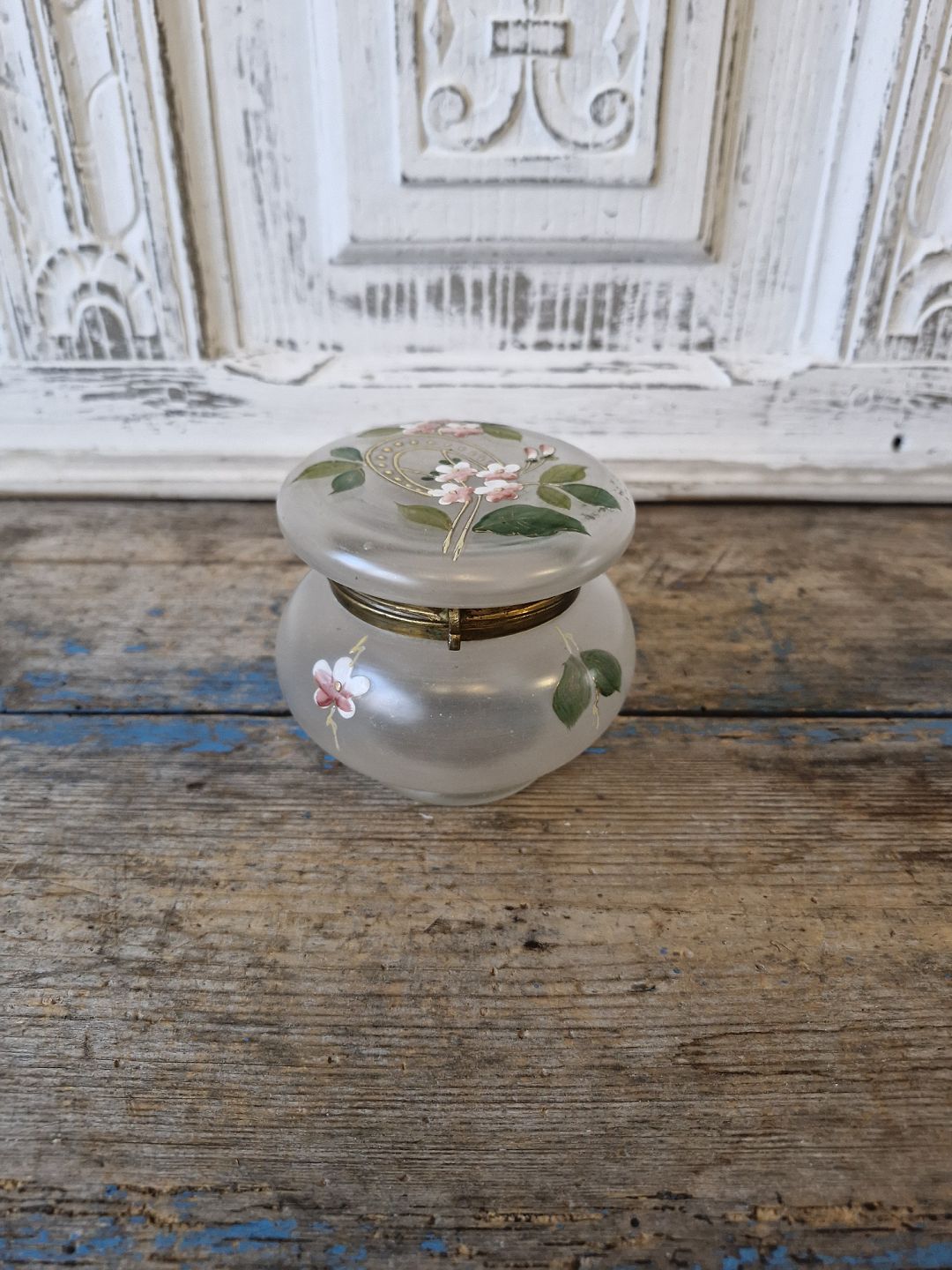 Glass jewelry box with gilded bronze mounting. Beautiful hand-painted floral motif with horseshoe.Height 9 cm. Diameter 10 cm.
