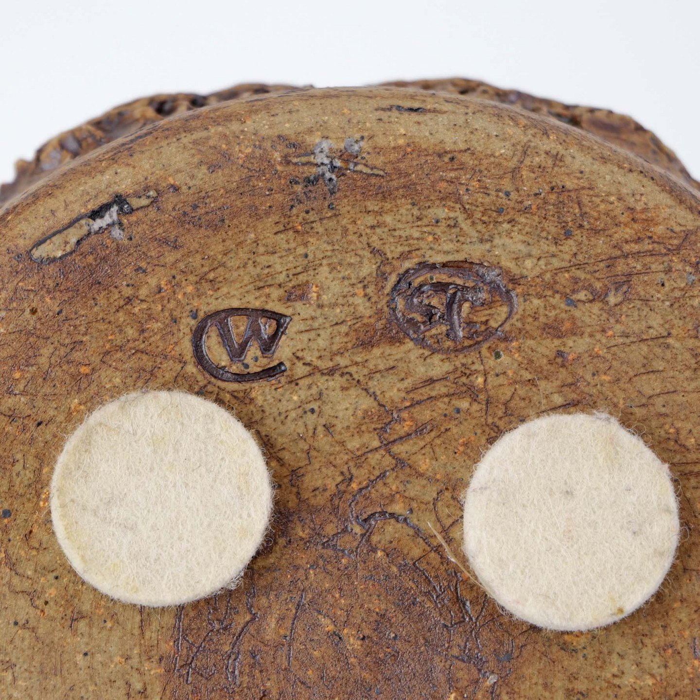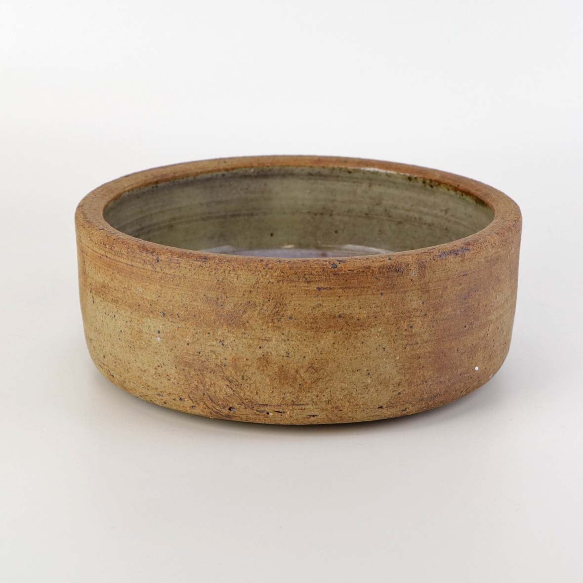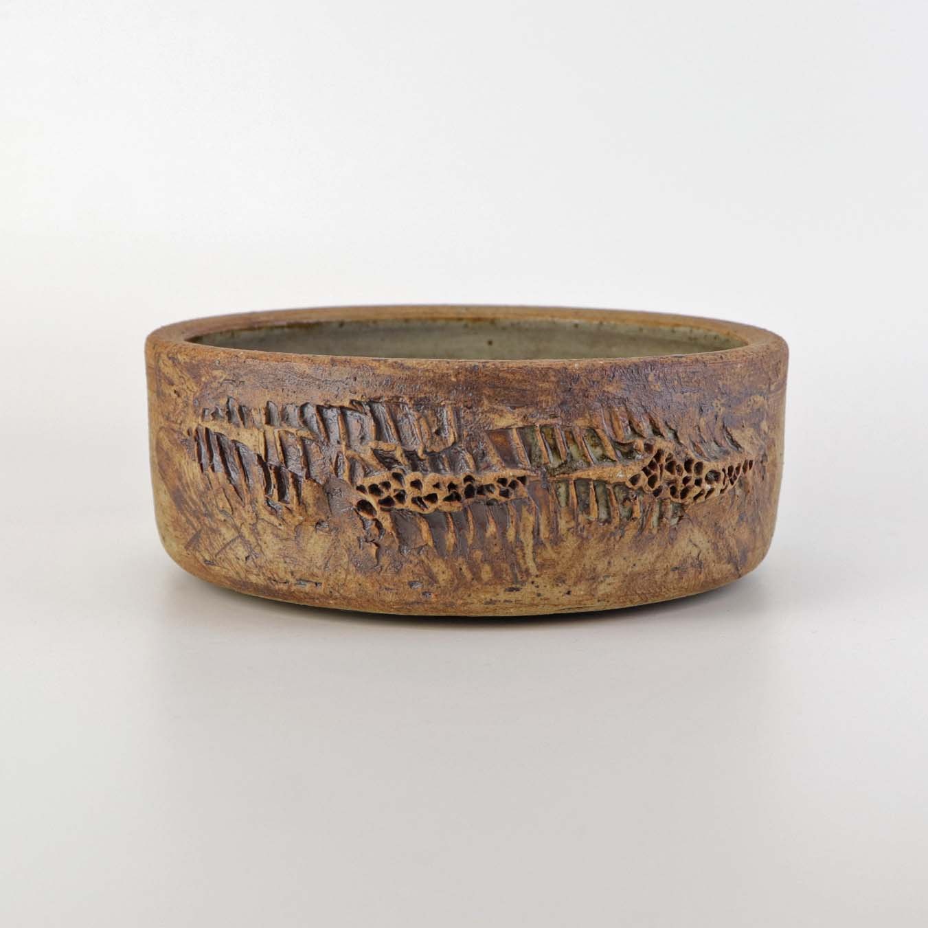 Rund skål i keramik med beige, grå og lyseblå glasur på indersiden samt uglaseret abstrakt mønster på ydersiden.Formgiver Conny Walther