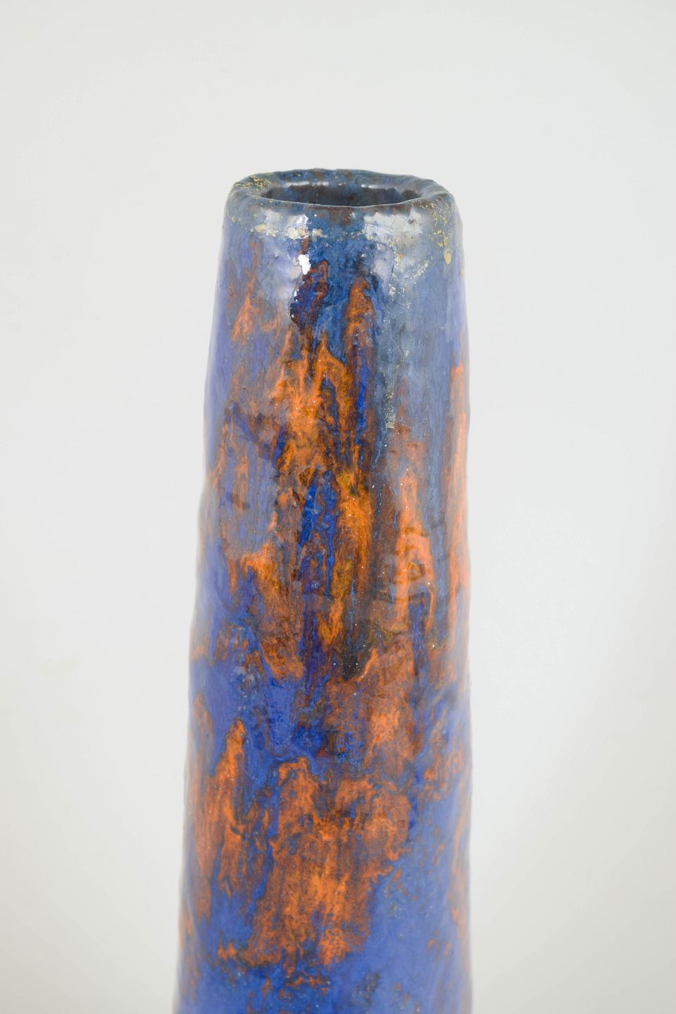 Very tall and slender vase in stoneware featuring a rare and experimental surface technique. The glaze appears in deep blue tones with strong vertical flows in warm rust and earthy hues, creating a striking and dynamic expression. The restrained form emphasises its sculptural character.