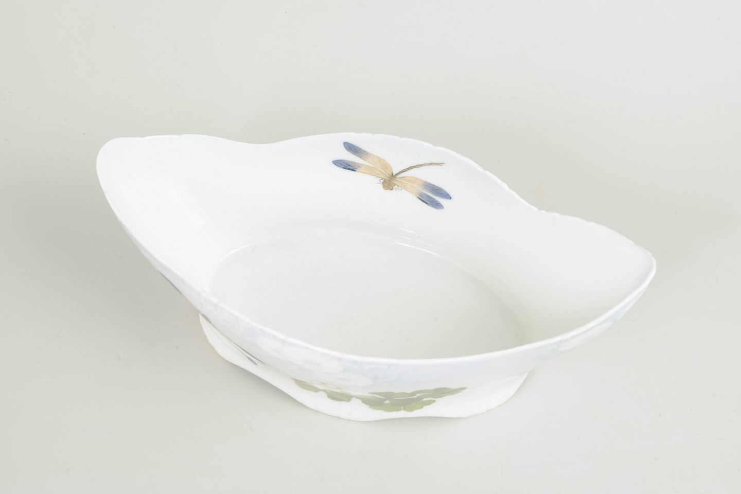 Softly shaped porcelain jardiniere executed in the Art Nouveau style with an organic, undulating contour and hand-painted decoration featuring butterflies and foliage motifs. A decorative planter from the early 1900s, characteristic of the period’s nature-inspired design language.
