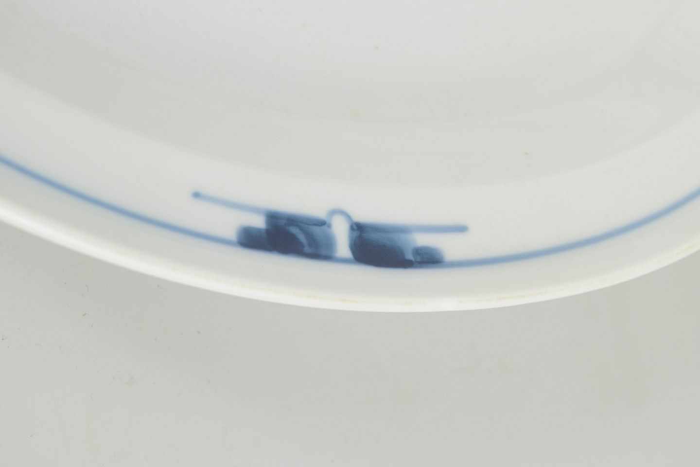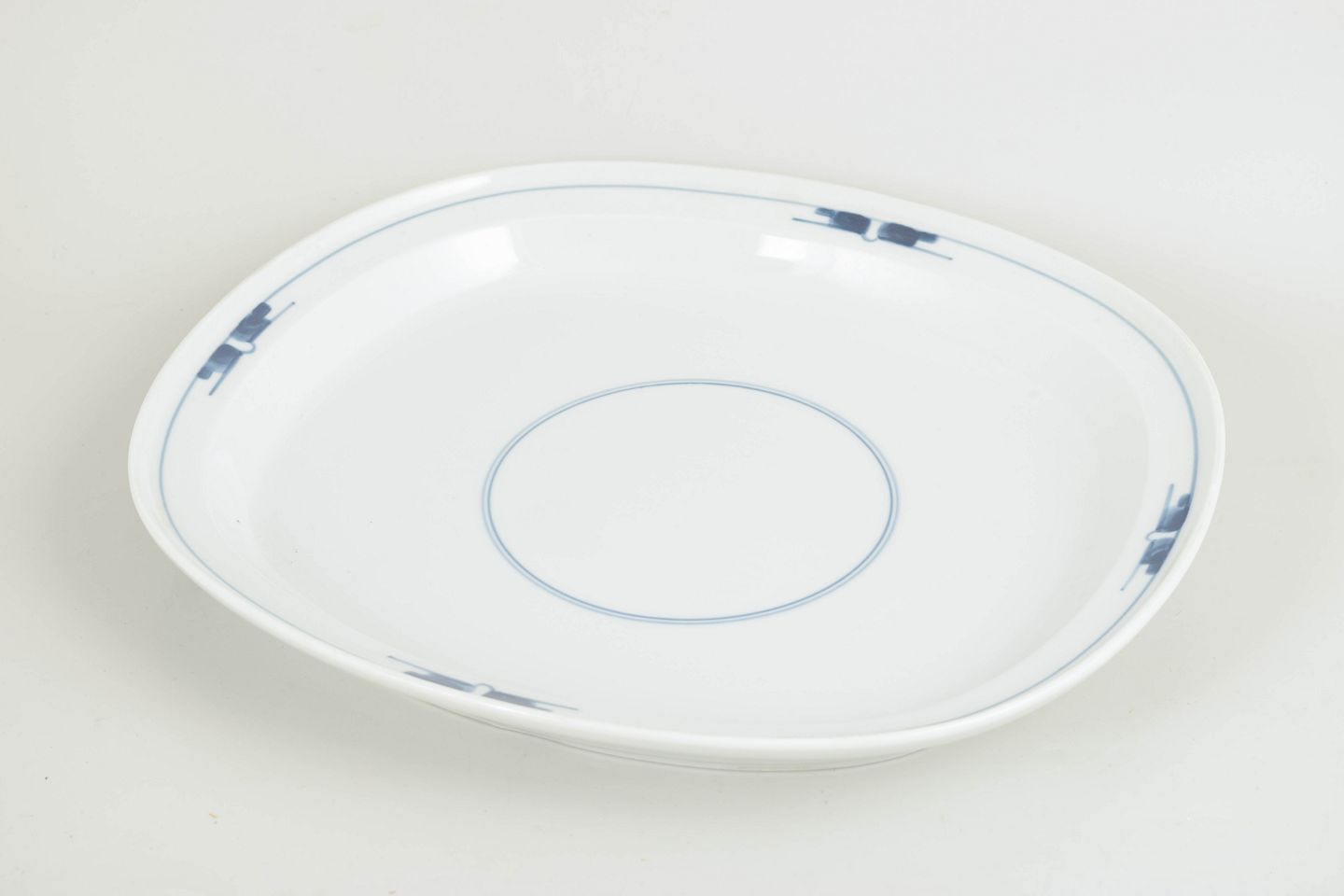 Large serving platter from the Gemina service, produced in white porcelain with a subtle, graphic blue underglaze decoration. The clean, almost architectural form emphasises the service’s modernist character and makes the platter ideal for serving and presentation.