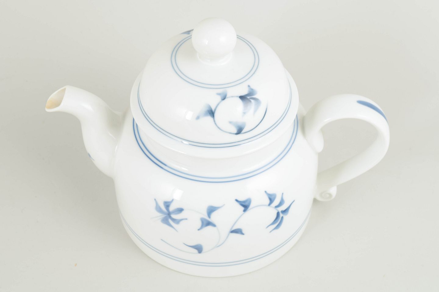 Royal Copenhagen Noblesse teapot, 1980s.Elegant porcelain teapot decorated with the characteristic Noblesse pattern in blue underglaze. A balanced, classic form with lid and gently curved spout, typical of Royal Copenhagen’s mid-20th-century design language.