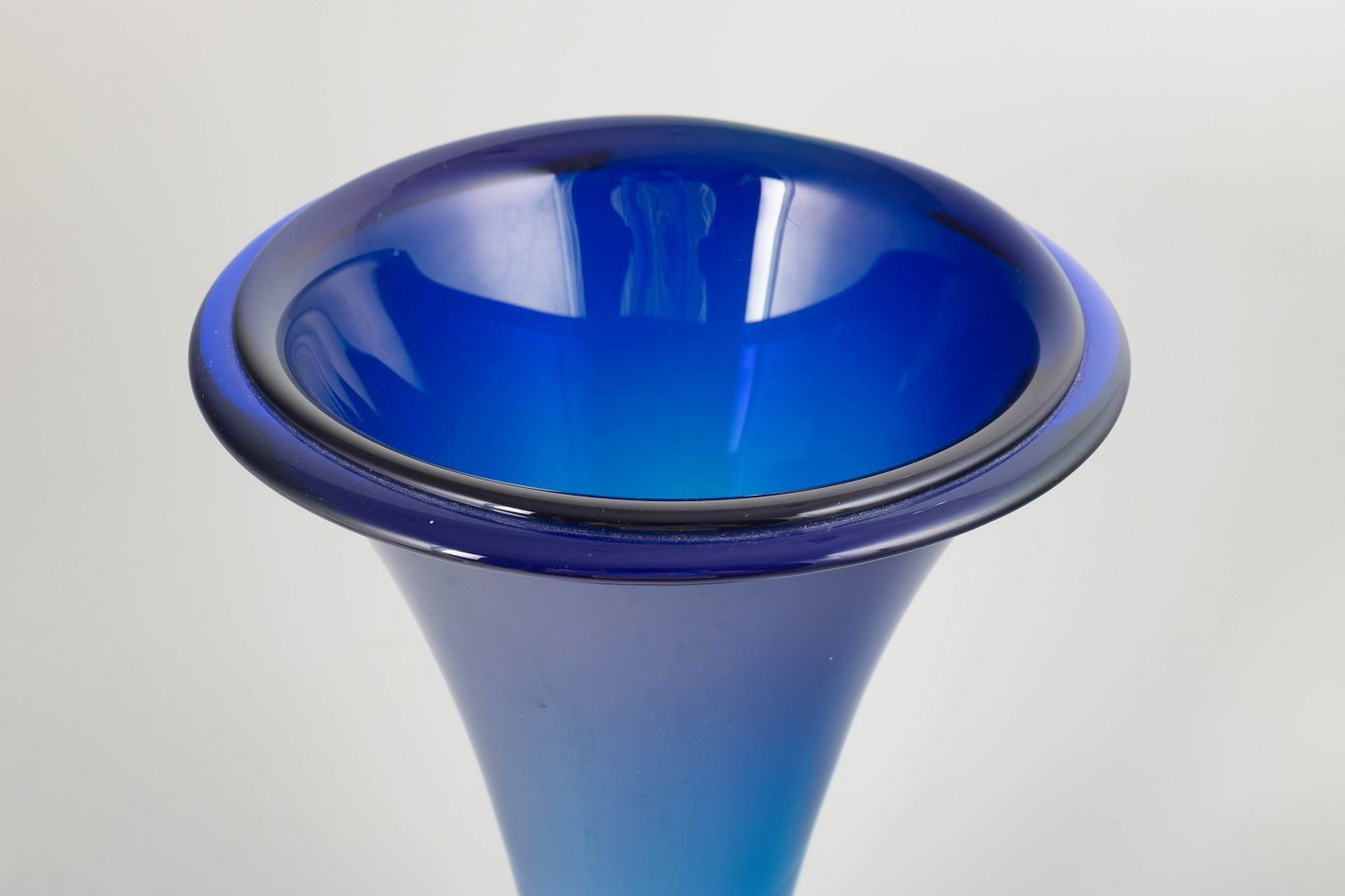 Elegant trumpet-shaped vase in mouth-blown, heavy crystal glass with a deep blue colour graduation. A striking example of Czech Art Deco glass with a solid foot and wide flared rim.