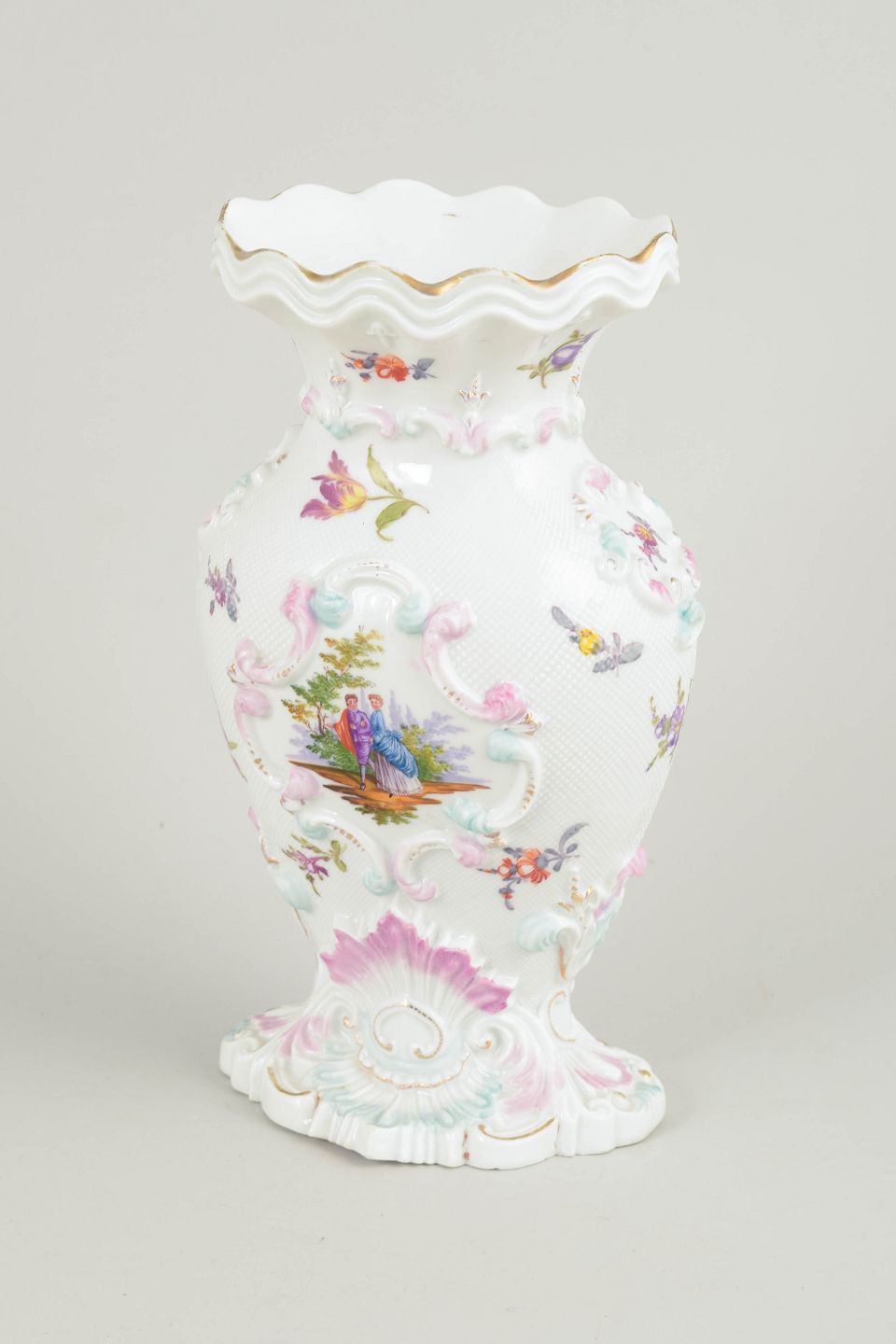 Meissen vase, early 19th century.Rare porcelain vase with rich relief modelling and hand-painted polychrome floral and landscape decoration. Shaped foot and scalloped rim. A fine example of Meissen’s decorative porcelain production from the early 19th century.