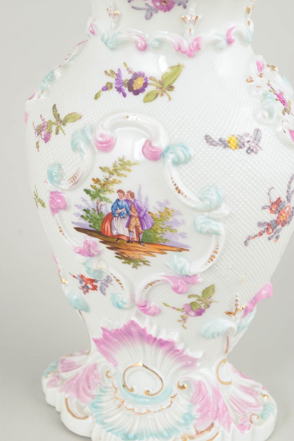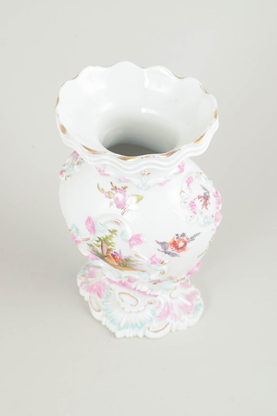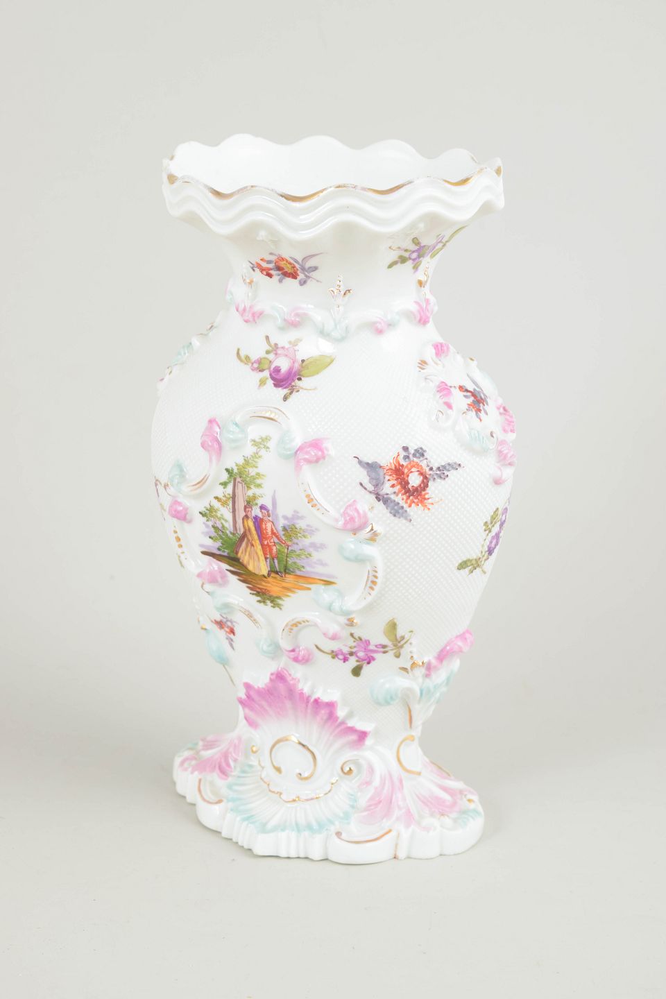 Meissen vase, early 19th century.Rare porcelain vase with rich relief modelling and hand-painted polychrome floral and landscape decoration. Shaped foot and scalloped rim. A fine example of Meissen’s decorative porcelain production from the early 19th century.