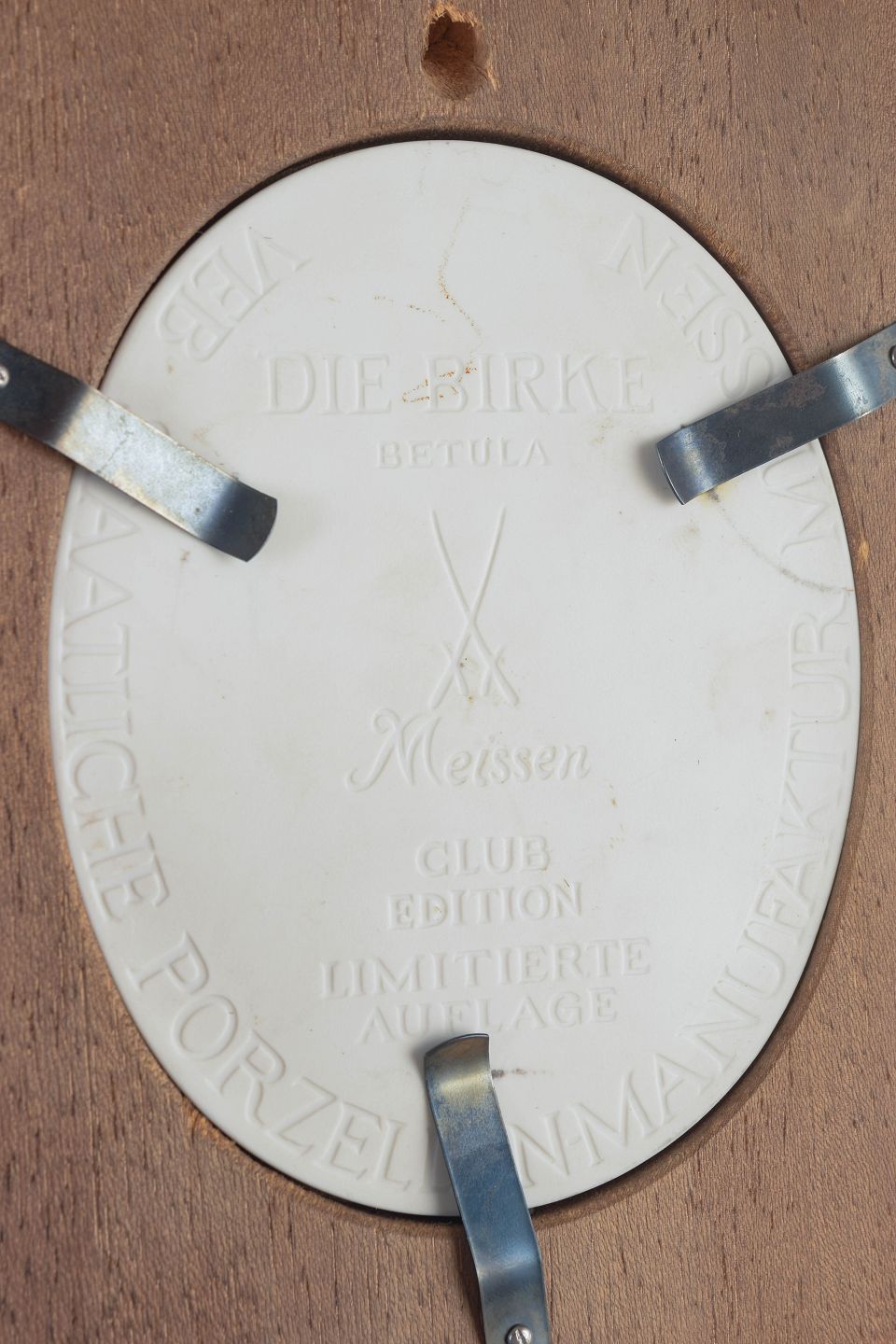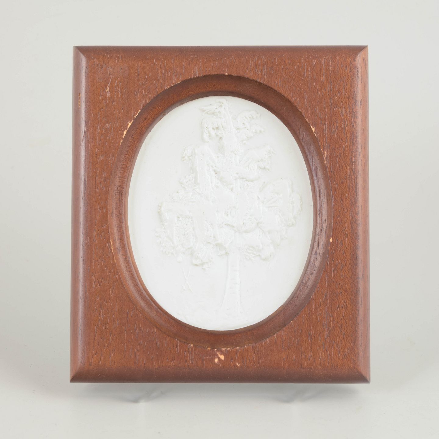 Meissen Biscuit plaque, c. 1970s.Relief plaque in white biscuit porcelain with a naturalistic tree motif, mounted in a rectangular wooden frame with an oval opening. The matte biscuit surface highlights the fine details of the relief, giving the piece a calm and classical appearance.
