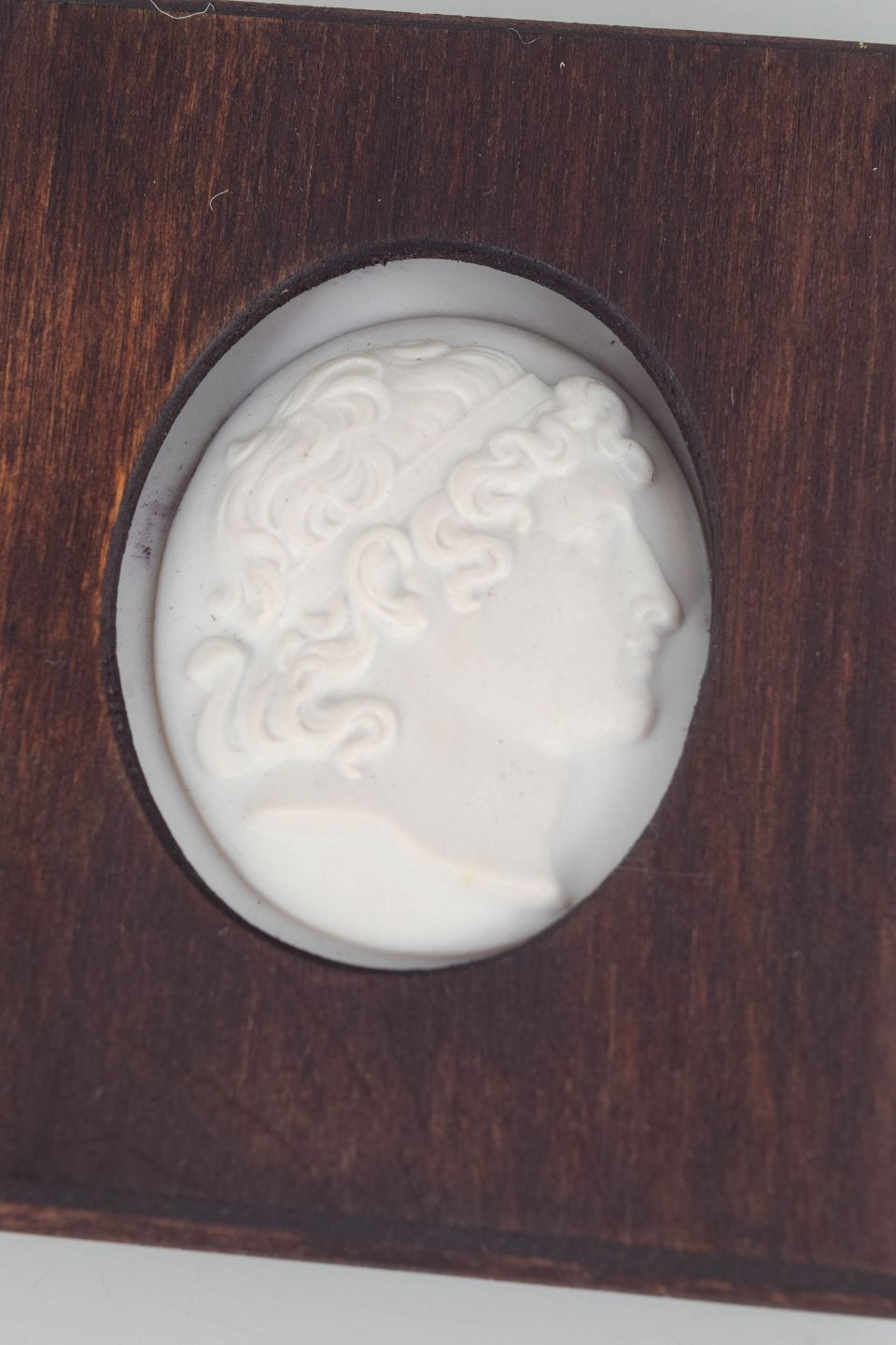 Small relief plaque in white biscuit porcelain with a classical profile portrait, mounted in a square wooden frame with an oval opening. The matte biscuit surface emphasises the soft contours of the face and hair, giving the piece a calm, sculptural appearance.