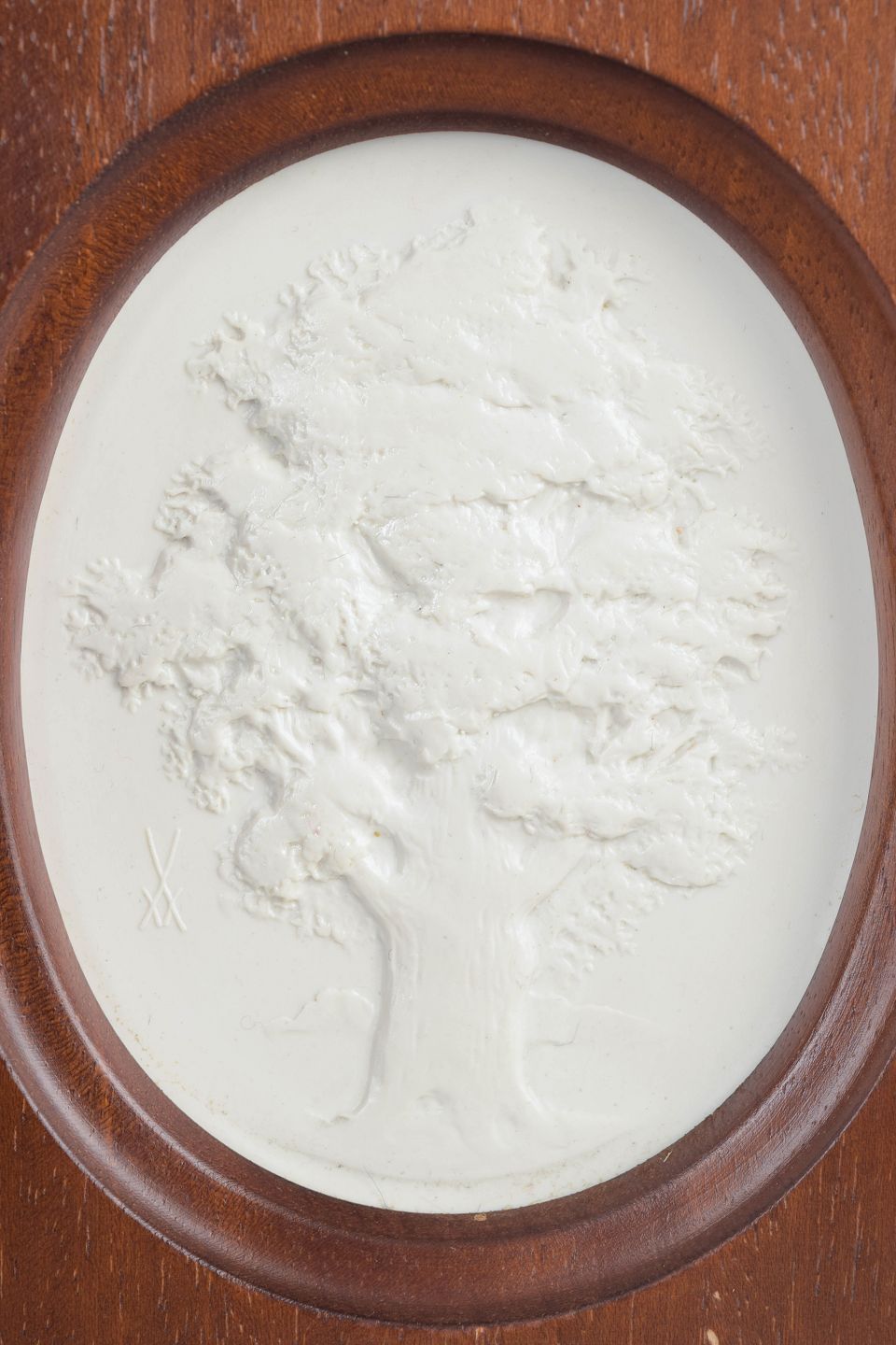 Relief plaque in white biscuit porcelain with a naturalistic motif, mounted in a rectangular wooden frame with an oval opening. A decorative wall piece executed in the classic Meissen tradition, with a matte surface that enhances the sculptural relief.