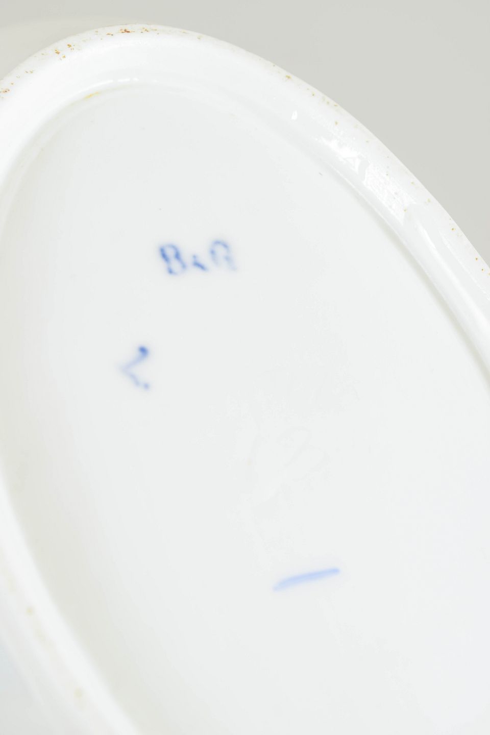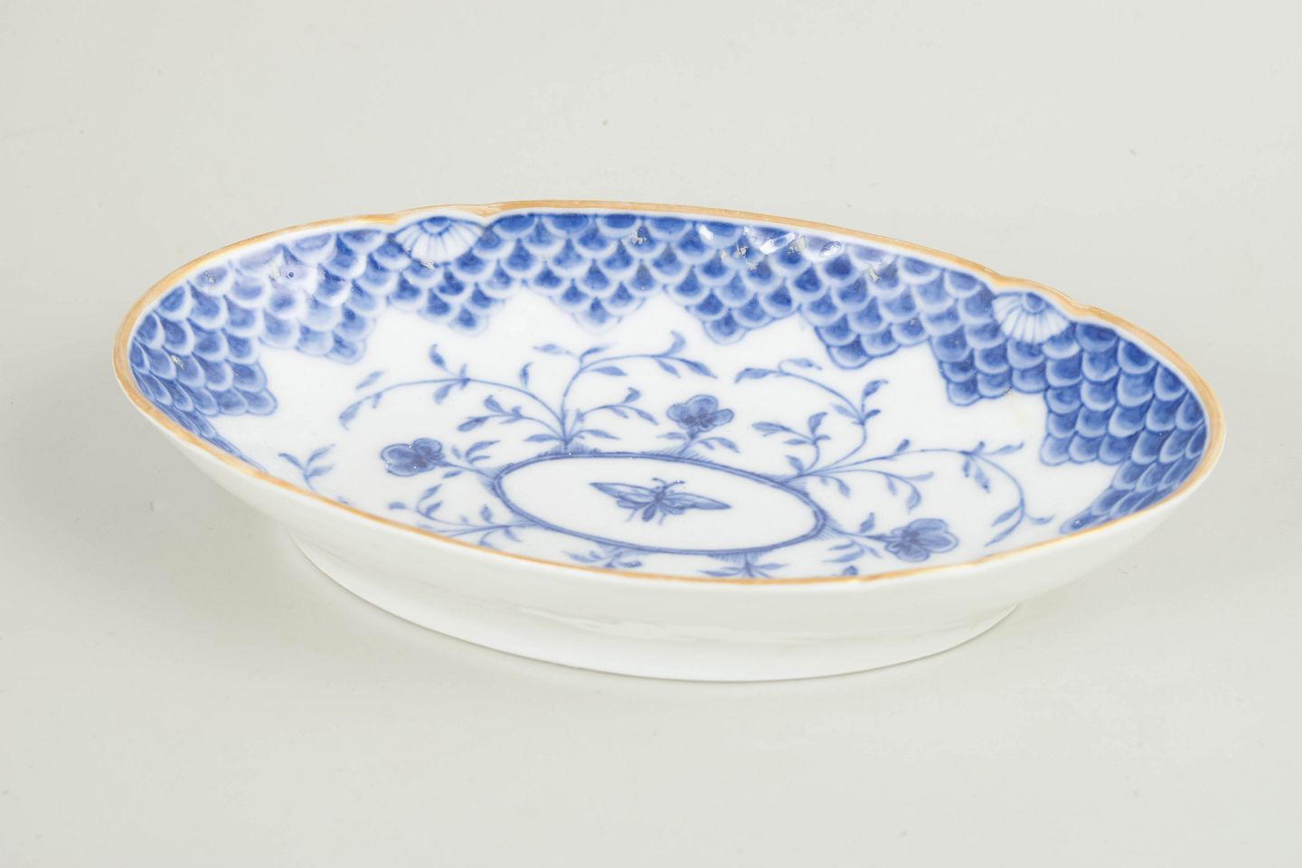 Bing & Grøndahl Butterfly dish with gilt rim, 1880s.Antique oval porcelain dish decorated in blue underglaze with the classic Butterfly pattern. The decoration is centred around a butterfly medallion with floral scrolls, framed by a distinctive scale-pattern border and finished with a hand-applied gilt rim. A rare early example from Bing & Grøndahl’s late 19th-century production.