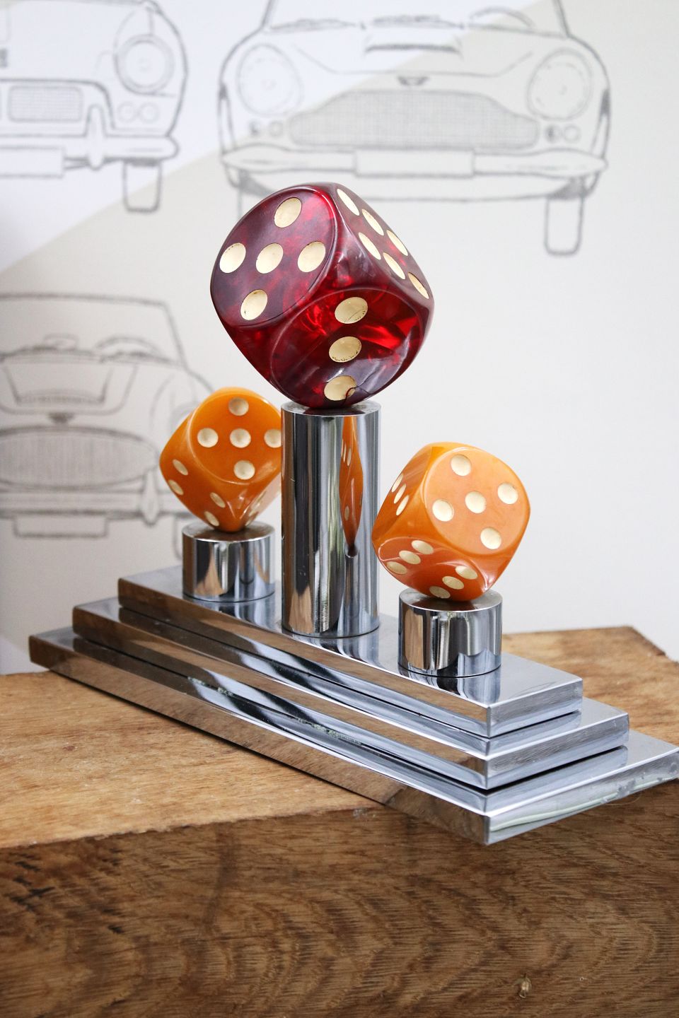 Decorative, old game trophy in chrome with 3 large dice in colored acrylic. H: 17cm. L&W: 21x8cm. (Weighs 3.5 kg.)Item number: Spille pokal