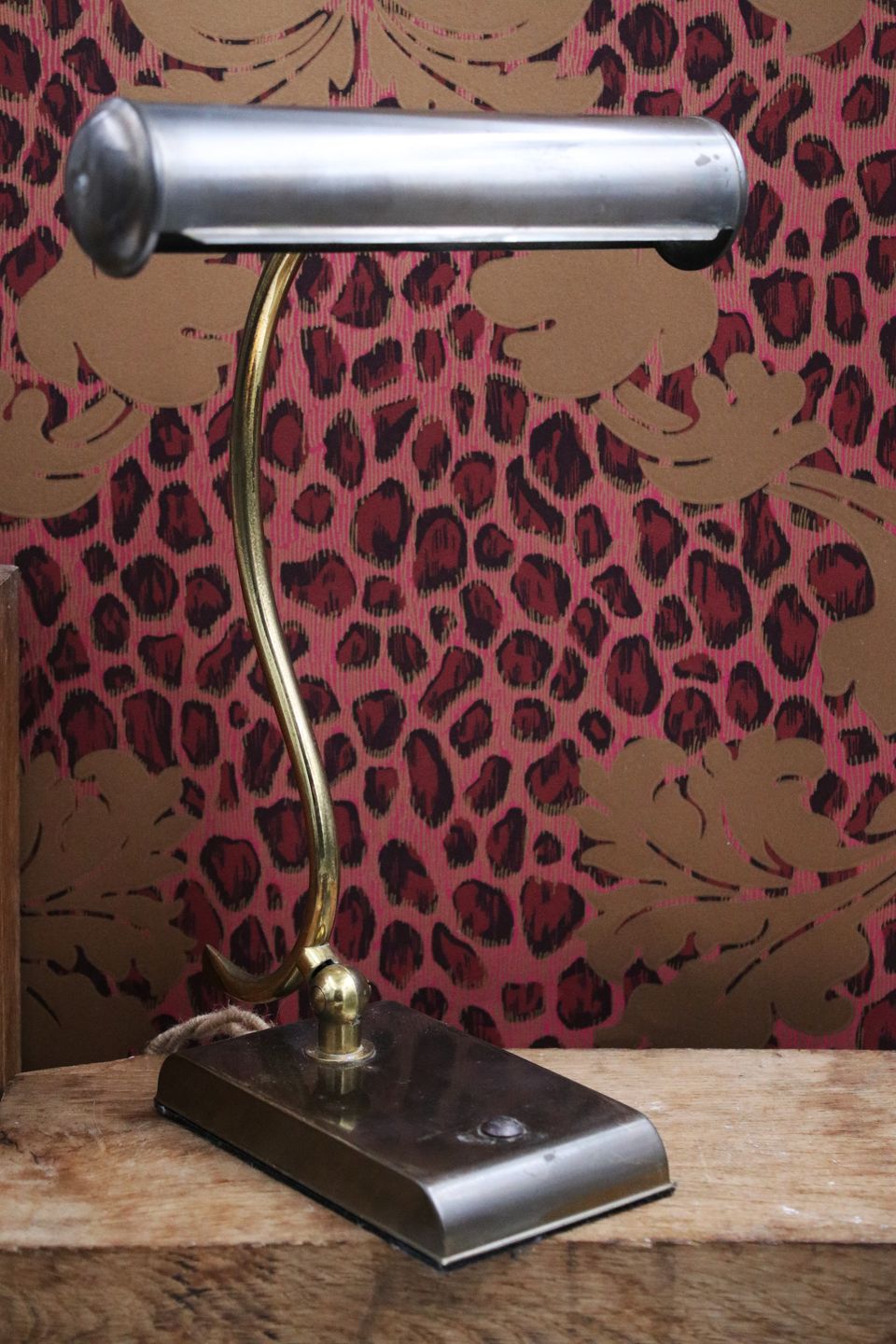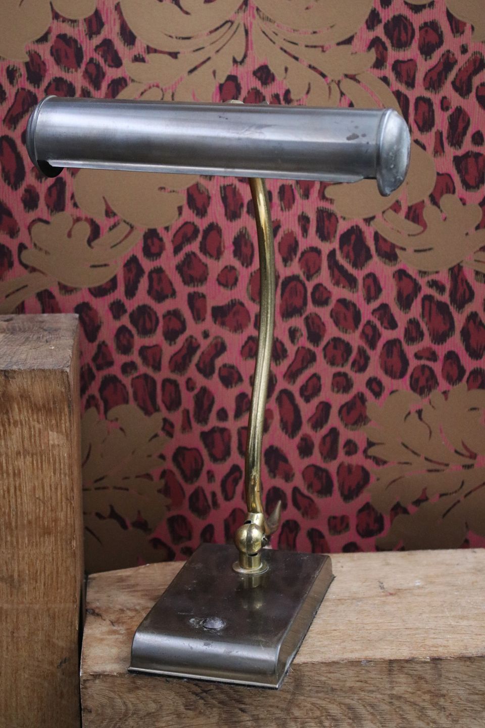 Old desk lamp in patinated brass.H: 31cm. Shade Dia.: L: 20.5cm. Dia.: 4.5cm.
