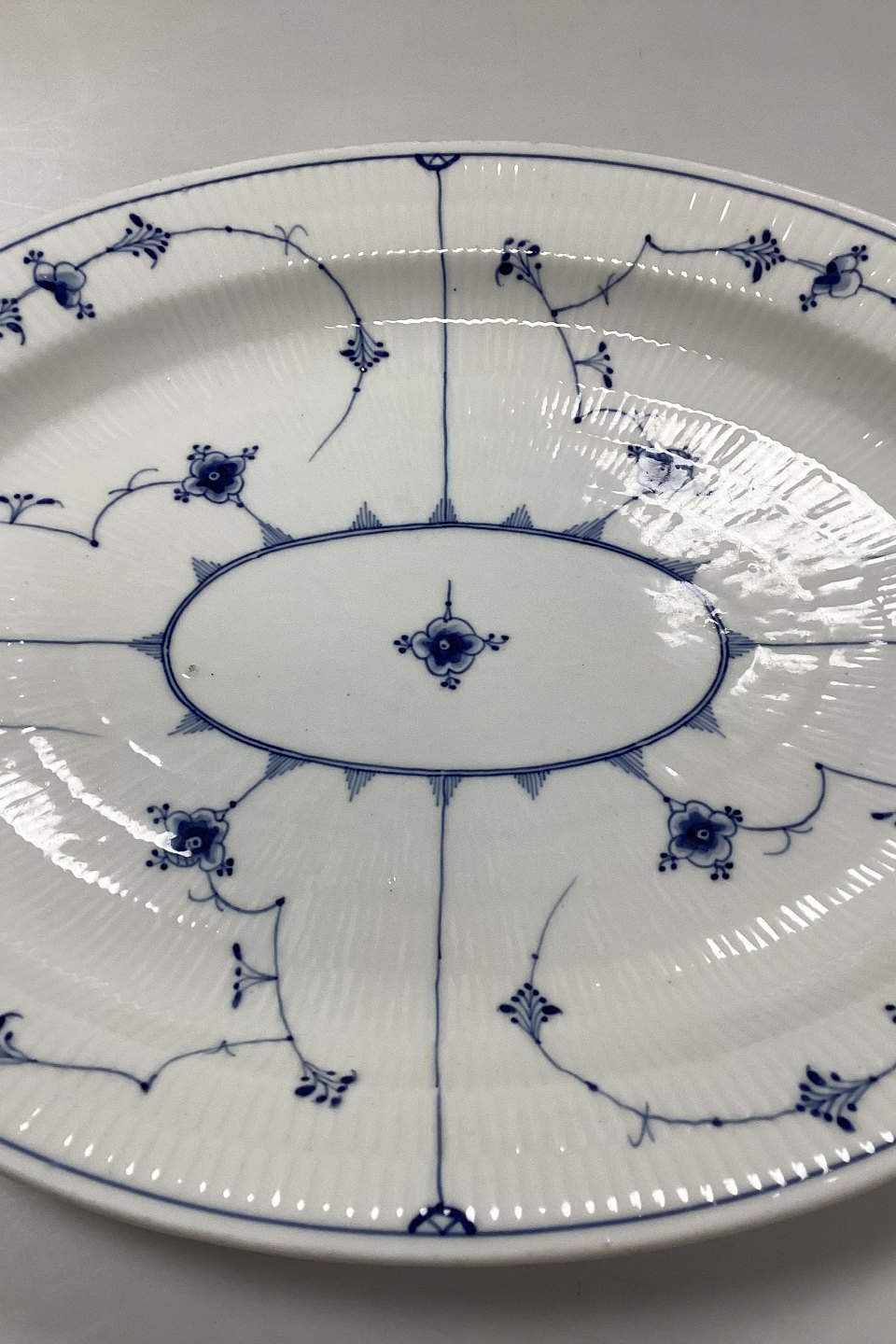 Royal Copenhagen Blue Fluted Plain Antique Oval Dish. Firing defect in the glaze and hairline crack at the bottom, see photo.
