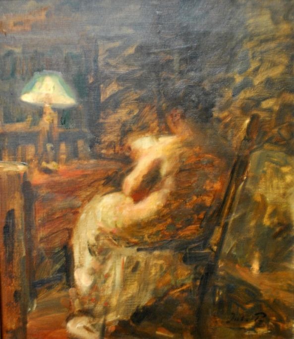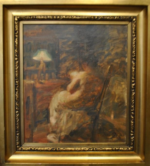 Paulsen, Julius (1860 - 1940) Denmark: Lamplight, interior. Oil on canvas. Signed. 38 x 33 cm.