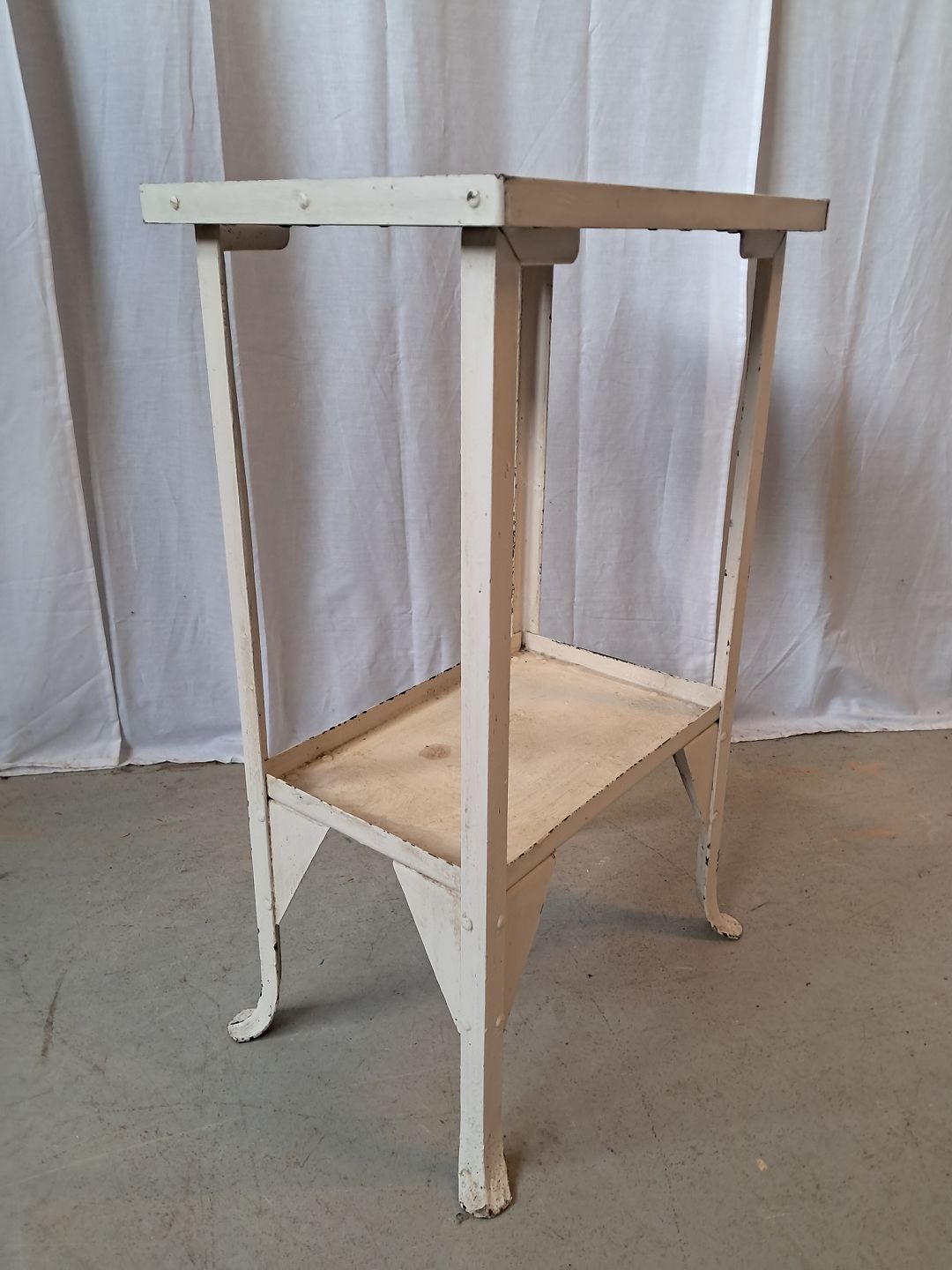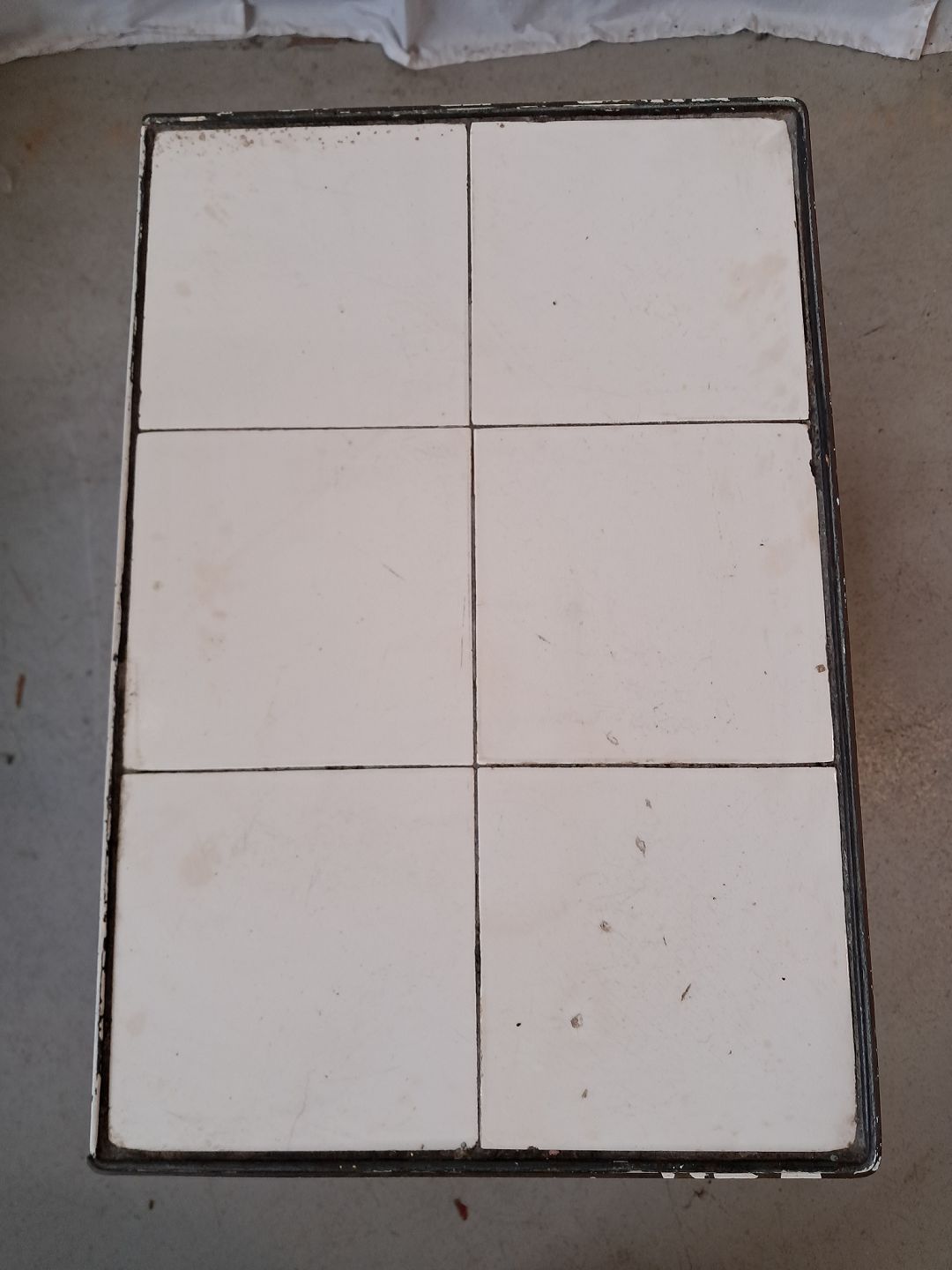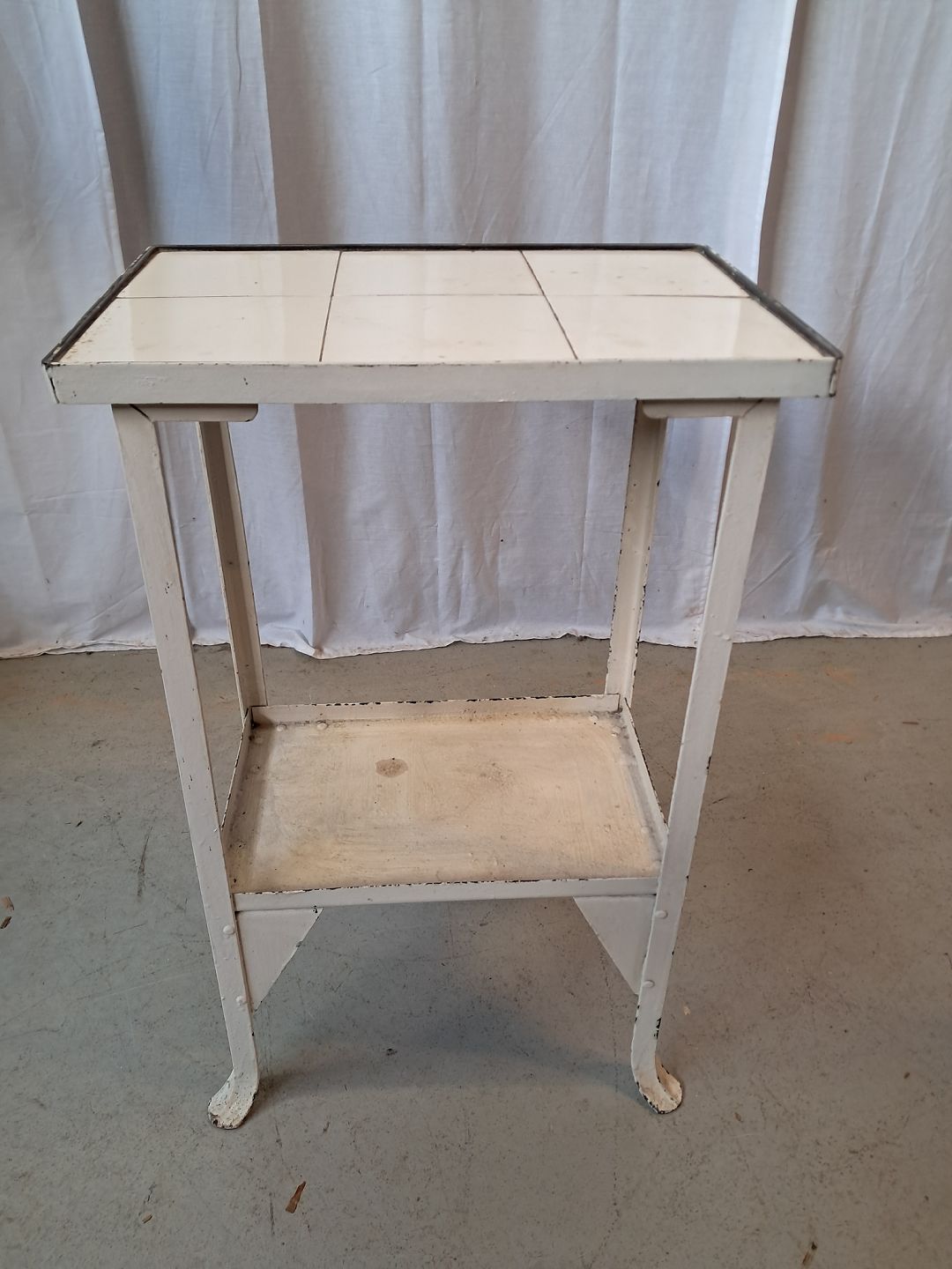 Lille gasbord i malet metal med fliser, fra 1930erne.Det har brugsspor.