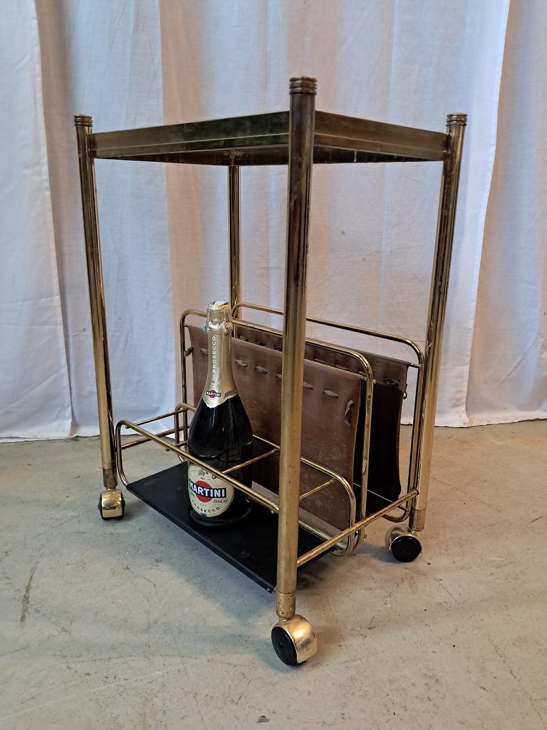 Bord i metal med magasinholder, flaskerum og glasplade, fra 1980erne.