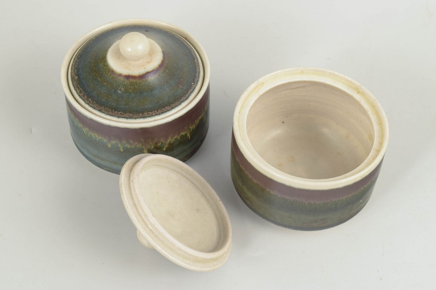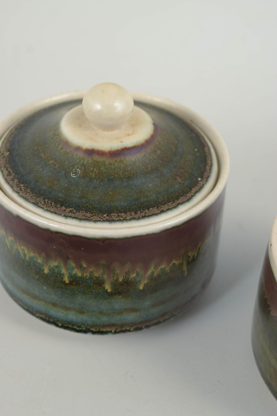 Pair of thrown stoneware lidded jars with cylindrical bodies and fitted lids topped with knobs. Finished with a lively, layered glaze in muted tones of green, blue, and brown with a light rim and pronounced horizontal glaze movement. Signed to the base and produced at Höganäs in the 1970s.