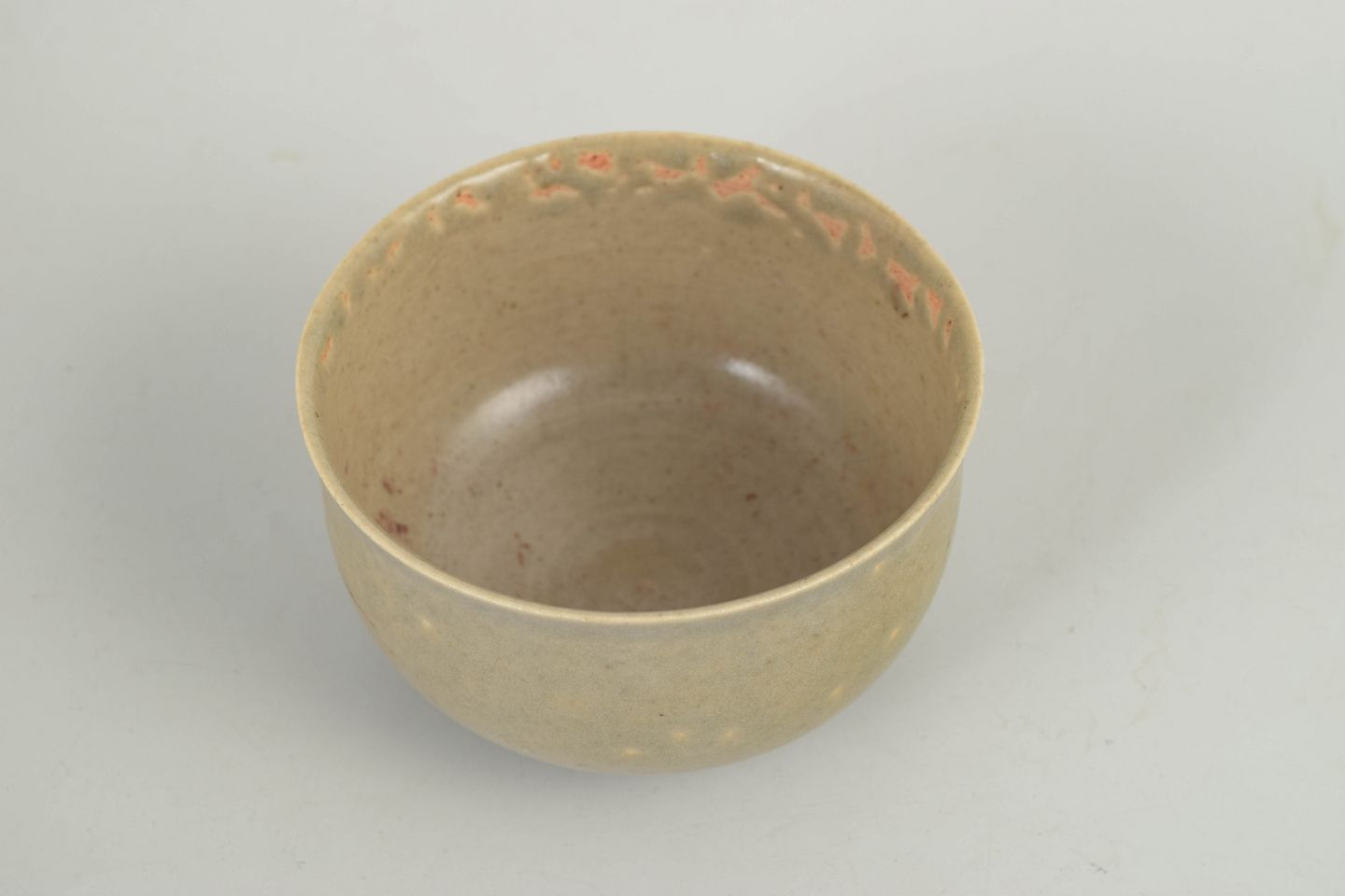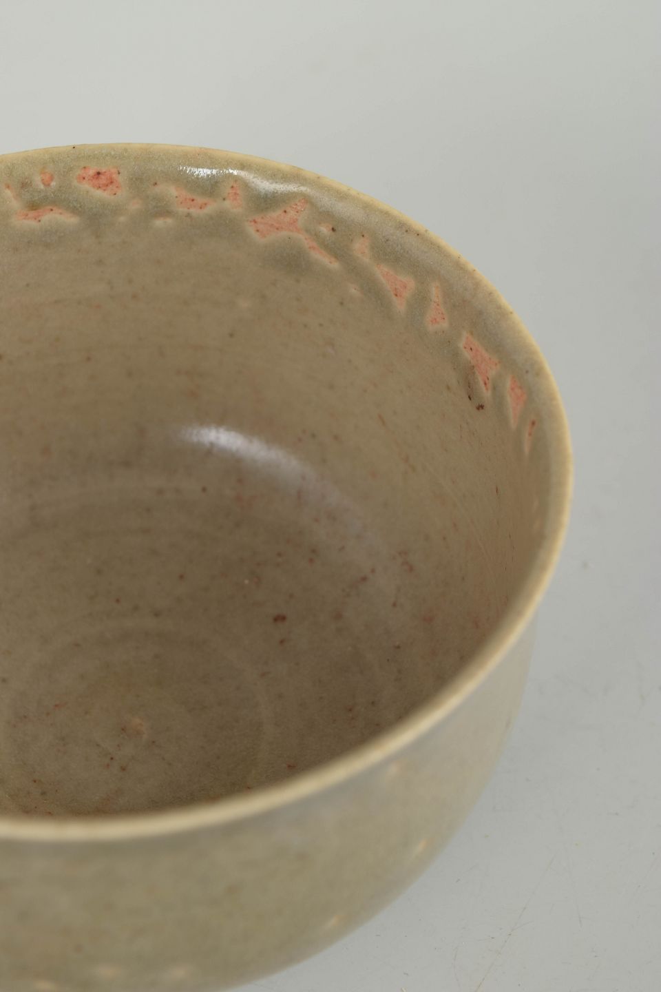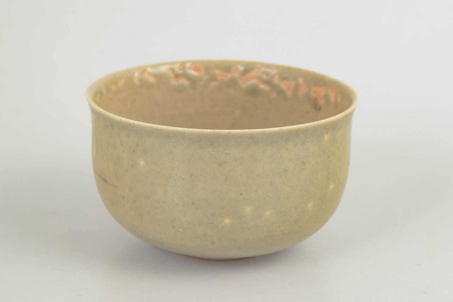 John Andersson for Höganäs, bowl.Thrown stoneware bowl with a rounded form and a slightly inward-curving rim. Finished with a light sand-coloured glaze showing subtle variations and gentle glaze movement along the edge. Signed to the base and produced at Höganäs in the 1970s.