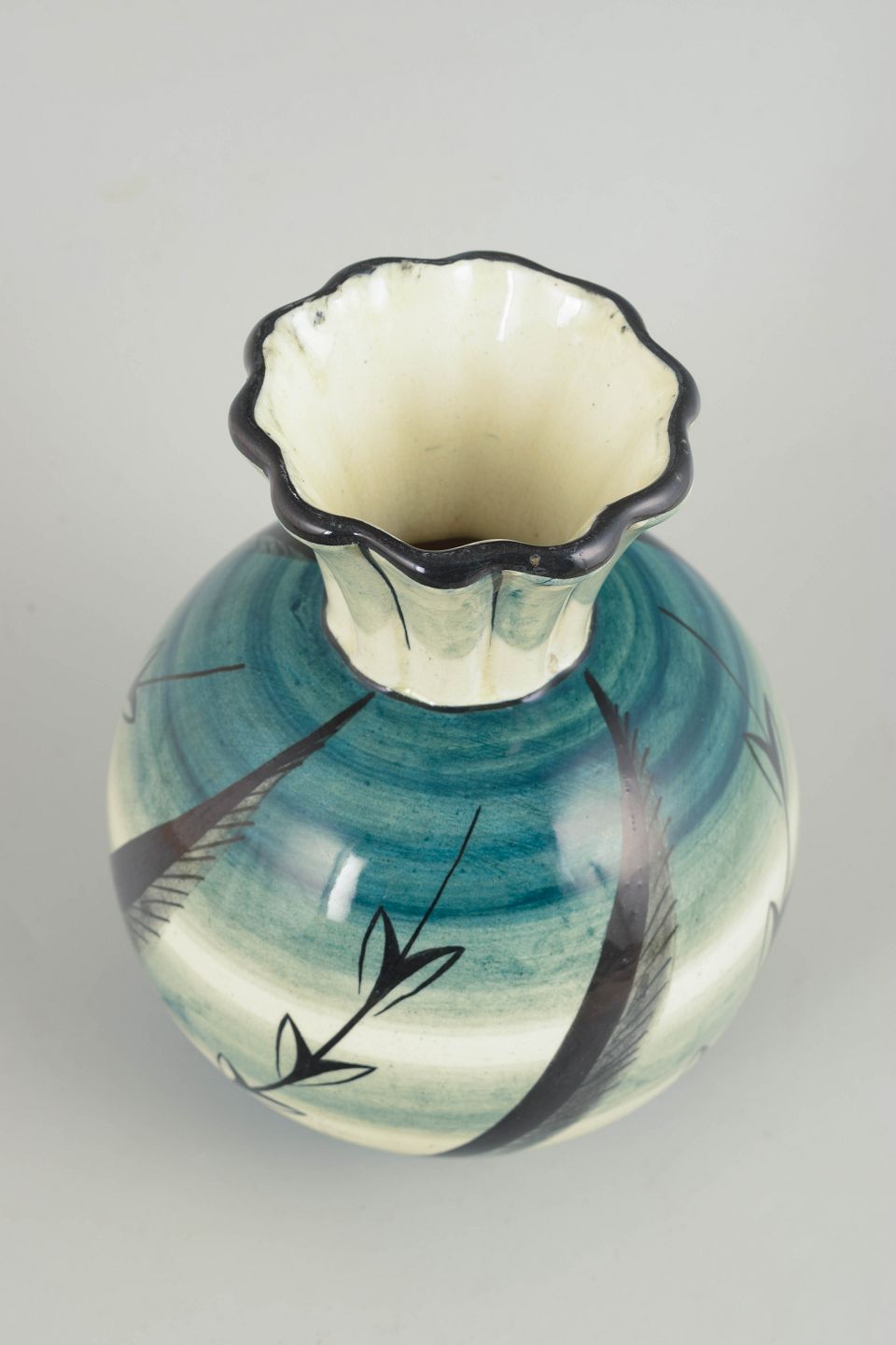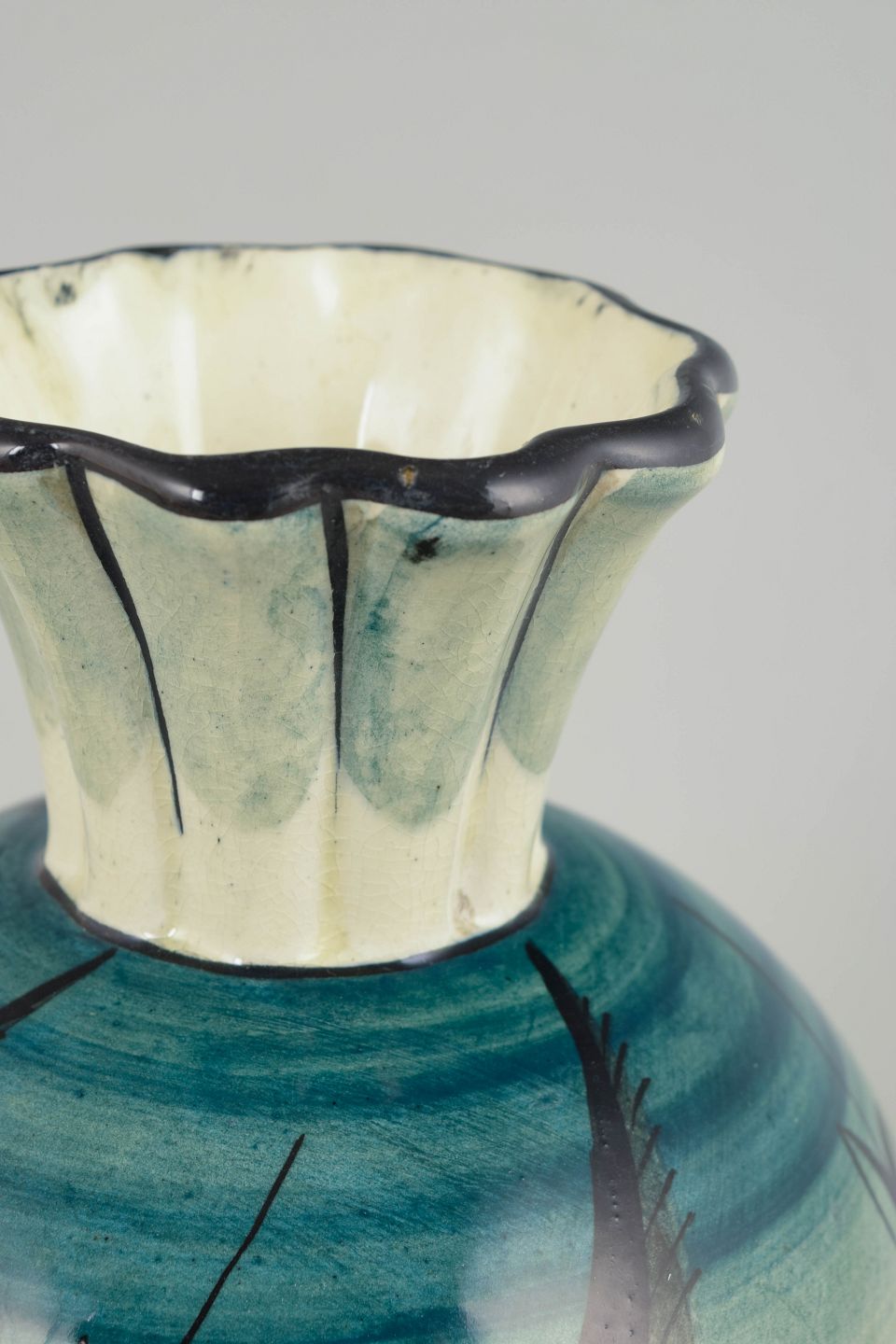 Ilse Claesson for Rörstrand, “Löja” vase.Art Deco faience vase with a well-balanced, rounded body and a slender neck with a softly undulating rim. Decorated in characteristic blue-green tones with stylised plant motifs and fine brushwork, executed in the distinctive “Löja” decoration developed during the 1930s. The model is a clear example of Swedish Art Deco, combining natural inspiration with graphic ornamentation.