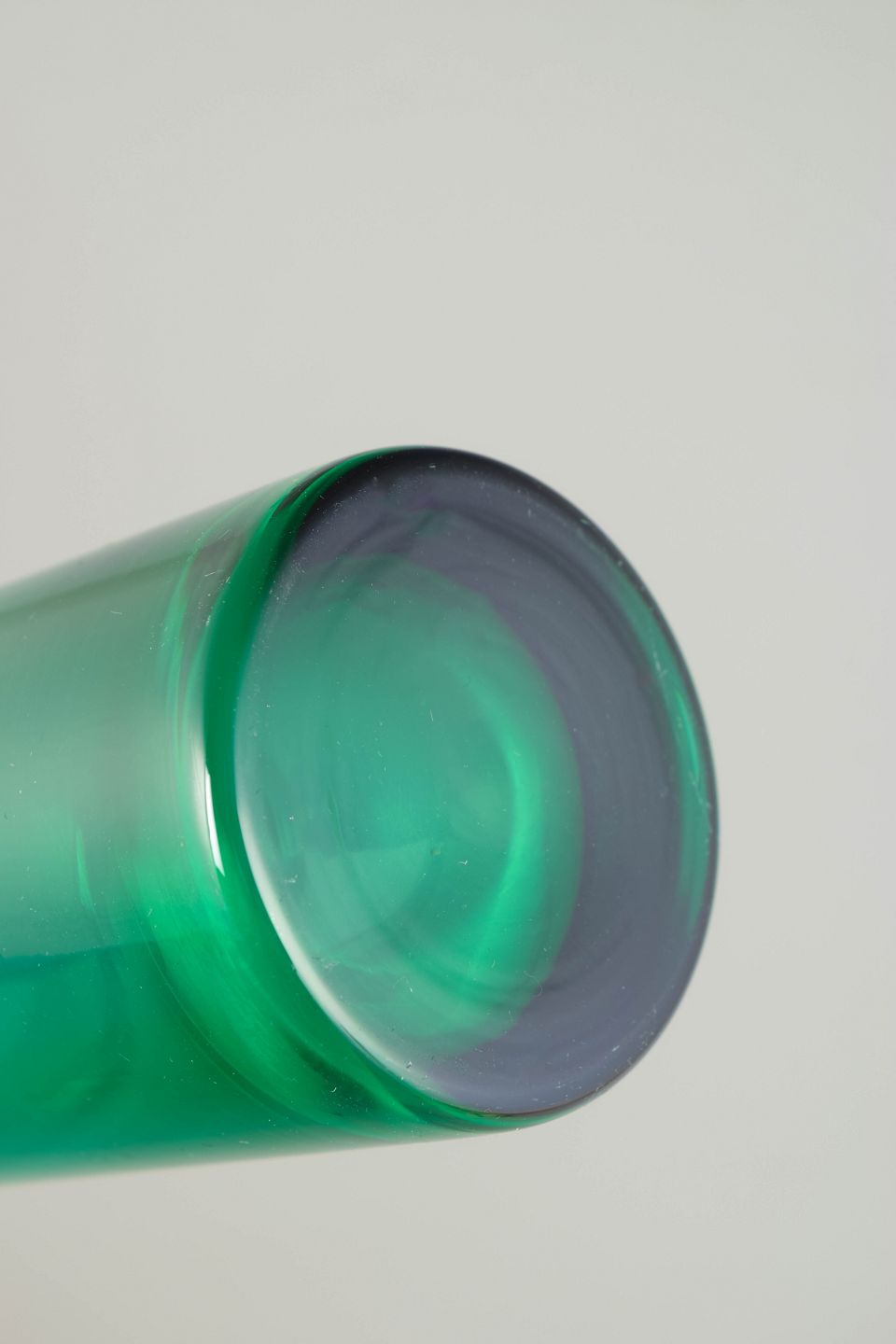 Tamara Aladin for Riihimäen Lasi, mouth-blown art glass vase.An elegant vase in clear turquoise-green glass with a balanced, sculptural profile and softly rounded form. Mouth-blown with a pronounced bowl-shaped upper section and cylindrical lower body, characteristic of Finnish art glass from the 1970s.