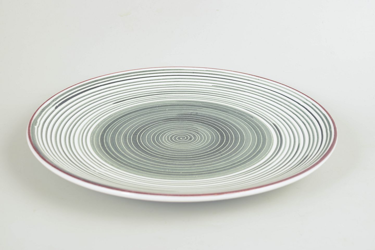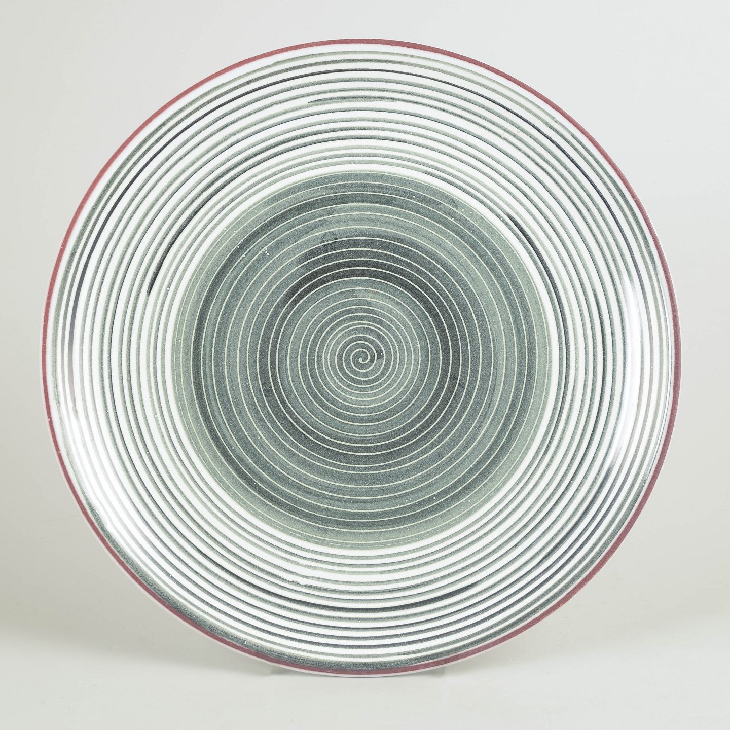 Hjördis Oldfors for Upsala-Ekeby, dish.Decorative glazed ceramic dish with a graphic spiral motif in grey-green tones and a red rim. The piece presents a clean, period-correct Swedish modernist expression from the 1930s/40s, noted as model 53.