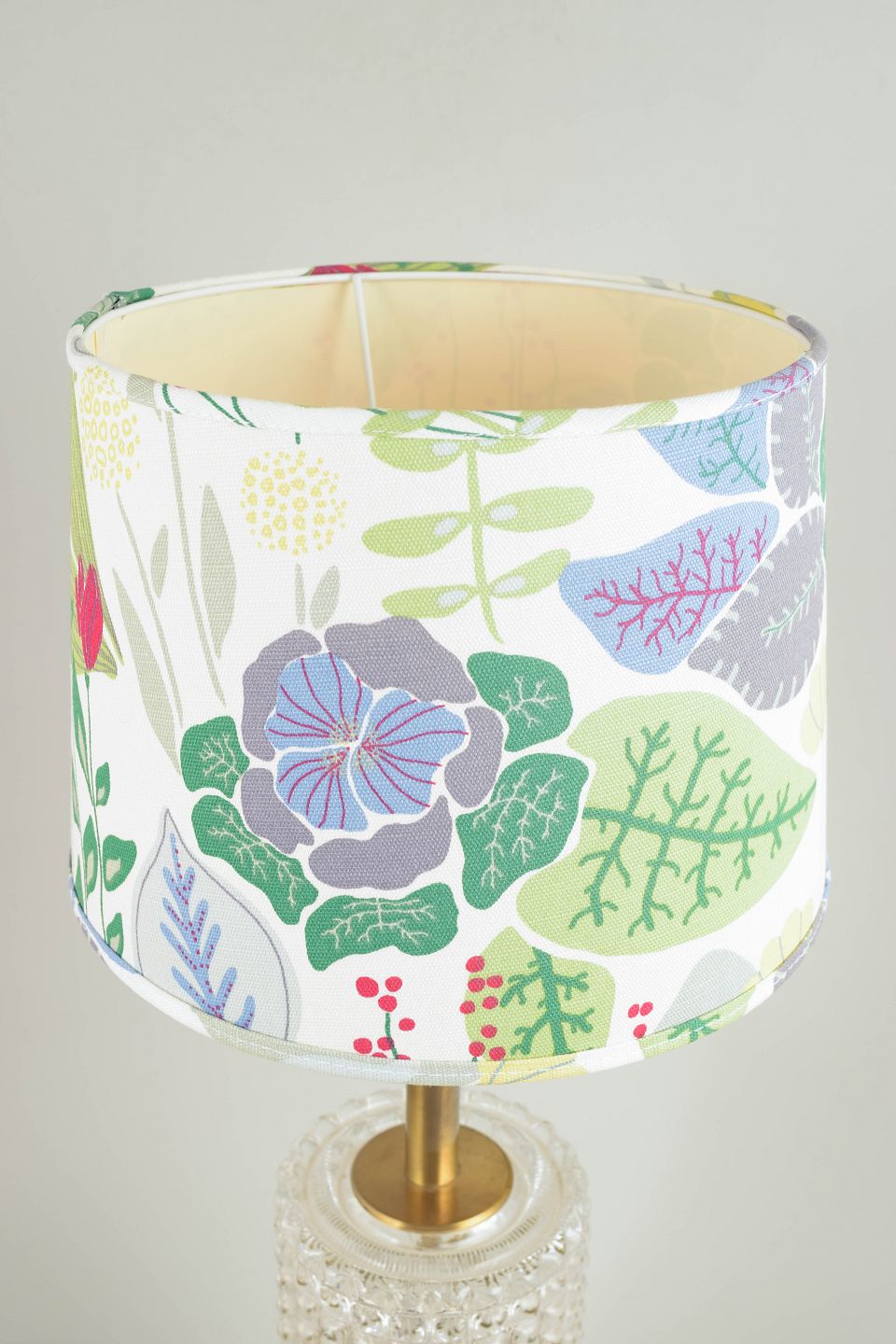 Swedish designer table lamp with shade by Josef Frank.Elegant table lamp in brass with two cylindrical sections in pressed glass and a warm golden finish. The model is Aneta B515. Fitted with a fabric shade decorated with a botanical pattern based on designs by Josef Frank. A characteristic example of mid-20th-century Scandinavian lighting design, combining functionality with a decorative aesthetic.