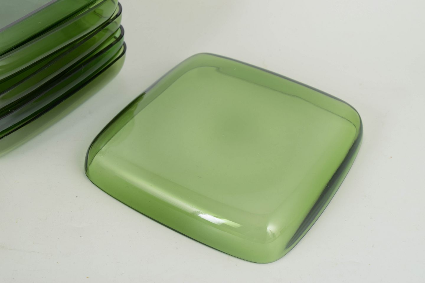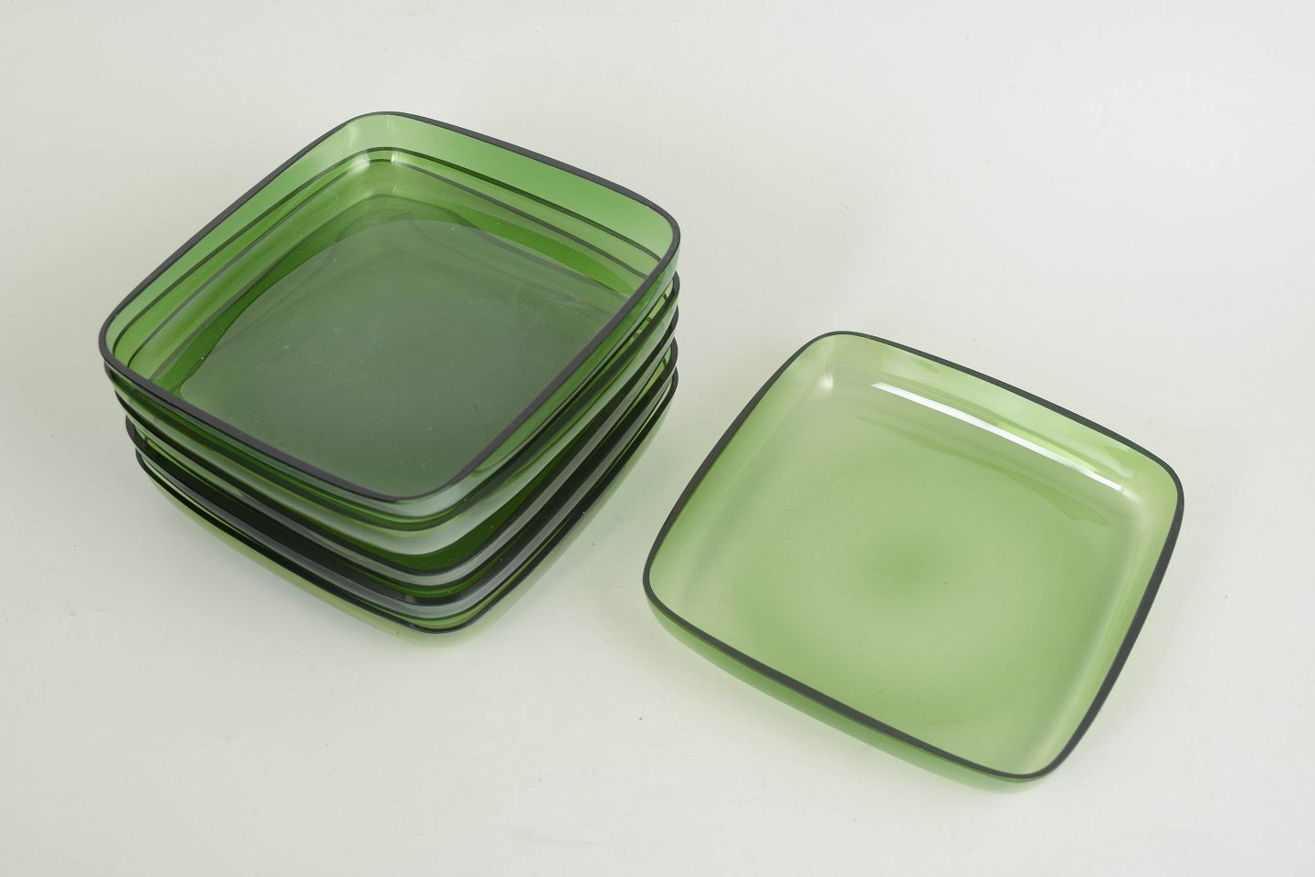 Set of 6 Swedish Glass Plates.Set comprising six handmade green glass plates with softly rounded corners and a gently raised rim. A restrained and functional design with a clear Scandinavian modernist expression.